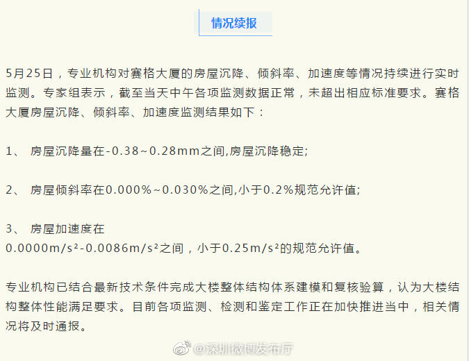 5月25日,專業機構對賽格大廈的房屋沉降、傾斜率、加速度等情況持續進行實時監測。專家組表示,截至當天中午各項監測數據正常,未超出相應標準要求。賽格大廈房屋沉降、傾斜率、加速度監測結果如下: