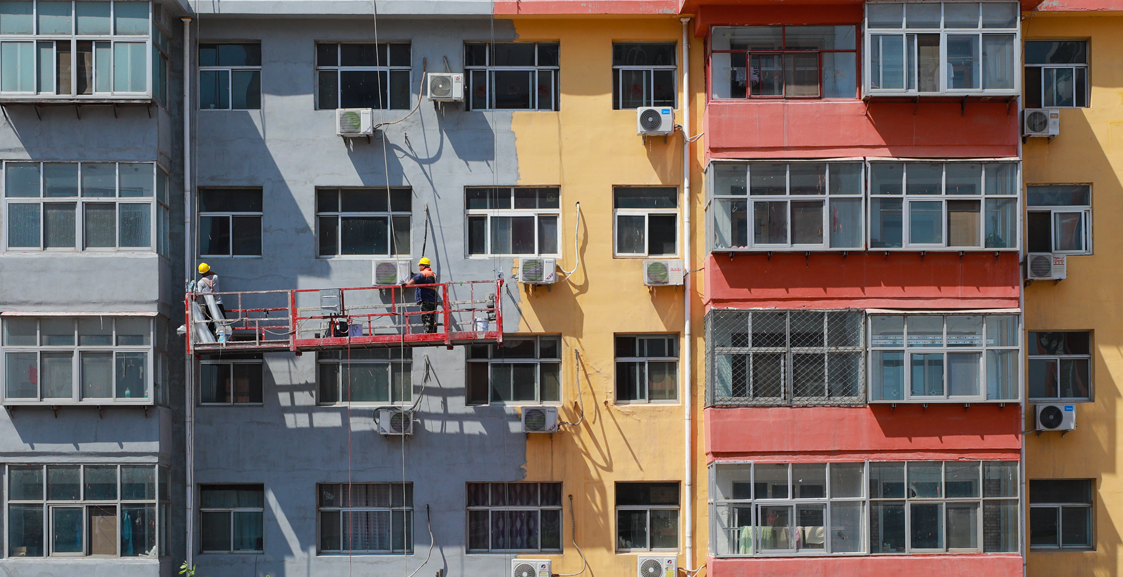 工人在故城縣樂園小區(qū)進(jìn)行外墻抹灰和外墻涂刷作業(yè)。