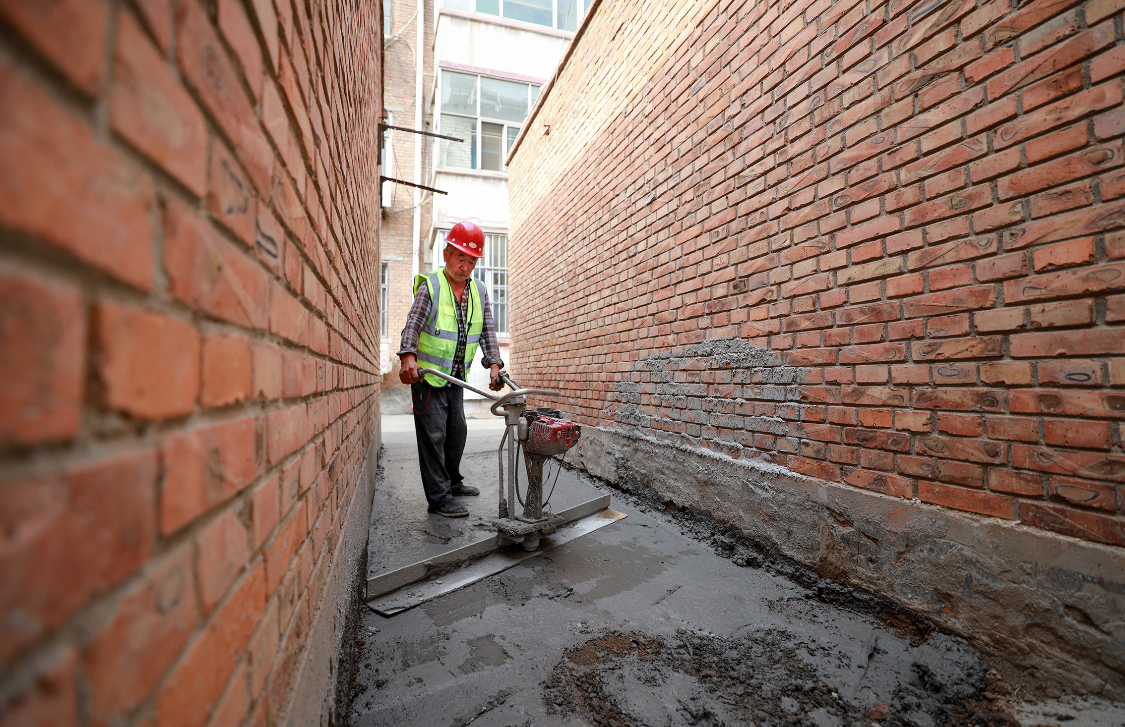 工人正在對(duì)冀州區(qū)綠地廣場(chǎng)西舊樓的便道基礎(chǔ)墊層進(jìn)行改造翻新。