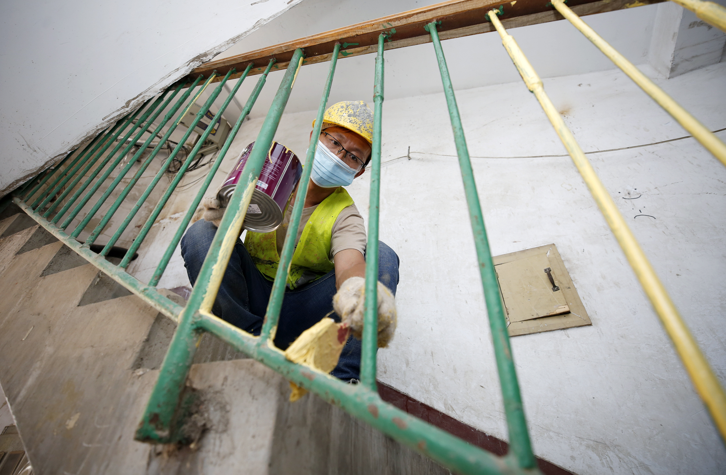 工人正在故城縣建行家屬院對(duì)樓梯扶手進(jìn)行刷漆作業(yè)。