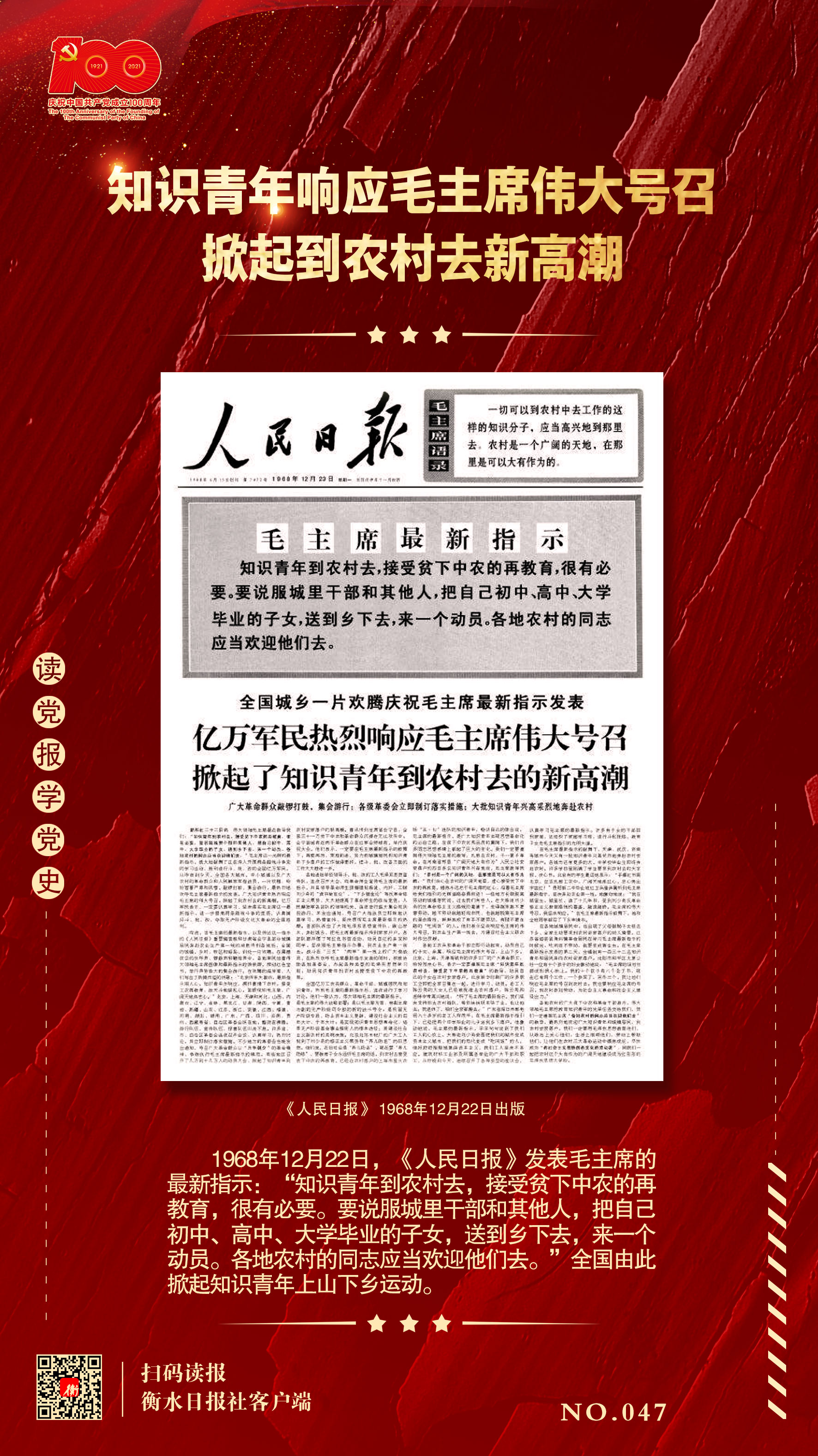 1968年12月22日《人民日?qǐng)?bào)》發(fā)表毛澤東的指示:“知識(shí)青年到農(nóng)村去,接受貧下中農(nóng)的再教育,很有必要。”全國(guó)掀起知識(shí)青年上山下鄉(xiāng)的高潮。1978年10月31日至12月10日,國(guó)務(wù)院召開全國(guó)知識(shí)青年上山下鄉(xiāng)工作會(huì)議。會(huì)議決定調(diào)整政策,逐步縮小上山下鄉(xiāng)的范圍,有安置條件的城市不再動(dòng)員下鄉(xiāng)。到1981年11月,城鎮(zhèn)知識(shí)青年上山下鄉(xiāng)運(yùn)動(dòng)結(jié)束。