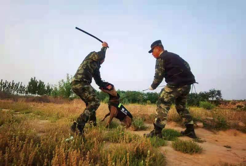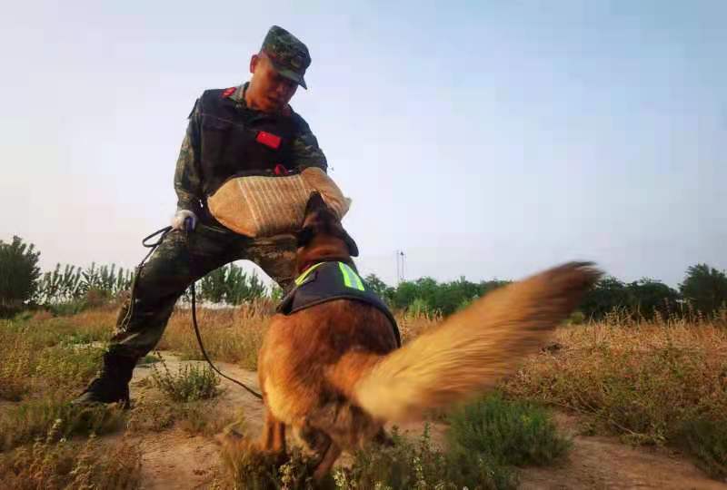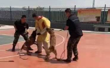 “安靜”“叫”“上”“咬住”“不放”“松開”……當(dāng)天上午,記者走進警犬訓(xùn)練營時,教練張建博正在指導(dǎo)訓(xùn)導(dǎo)員們對警犬進行撲咬訓(xùn)練。訓(xùn)練中設(shè)置了“不法分子”挑釁的情景,一訓(xùn)導(dǎo)員扮演的“不法分子”正向進行抓捕的武警戰(zhàn)士挑釁,兩名訓(xùn)導(dǎo)員命令其所帶警犬進行撲咬。隨著一聲令下,警犬迅速撲向“不法分子”,狠狠地咬住其戴著防護手套的手不松口,直至訓(xùn)導(dǎo)員發(fā)出“松開”的指令……完美地詮釋了警犬的“盡忠職守”。