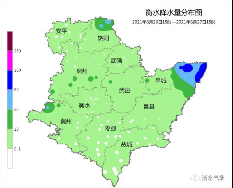 26日,全市最高氣溫升至37℃,走在戶外炙烤感很強。26日夜間,一場降雨對高溫進行了打壓。據市氣象臺監測,我市大部分地區都有降雨出現,雨量分布不均,全市有50個氣象站觀測到降水,過程總雨量最大為阜城縣的碼頭鎮86.4毫米,其次為王集84毫米,超過50毫米的還有霞口鎮69.9毫米,大白52.7毫米,另有16站10~36毫米,其它10毫米以下;全市平均雨量13.8毫米,桃城區0.2~11.5毫米。受降雨影響,27日下午3時,全市氣溫與前一日同時段相比下降了3℃~4℃。