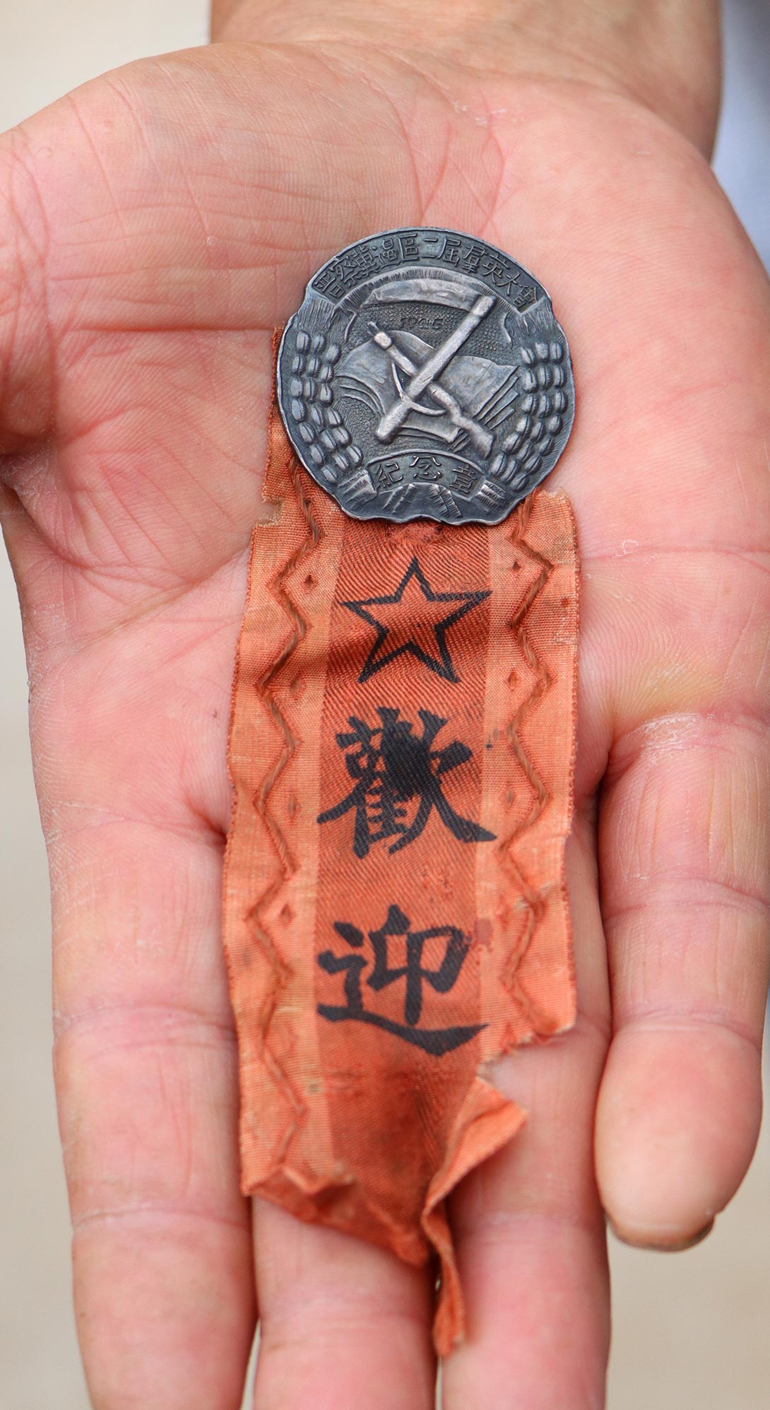 劉玉軍展示晉察冀邊區第二屆群英大會紀念章。