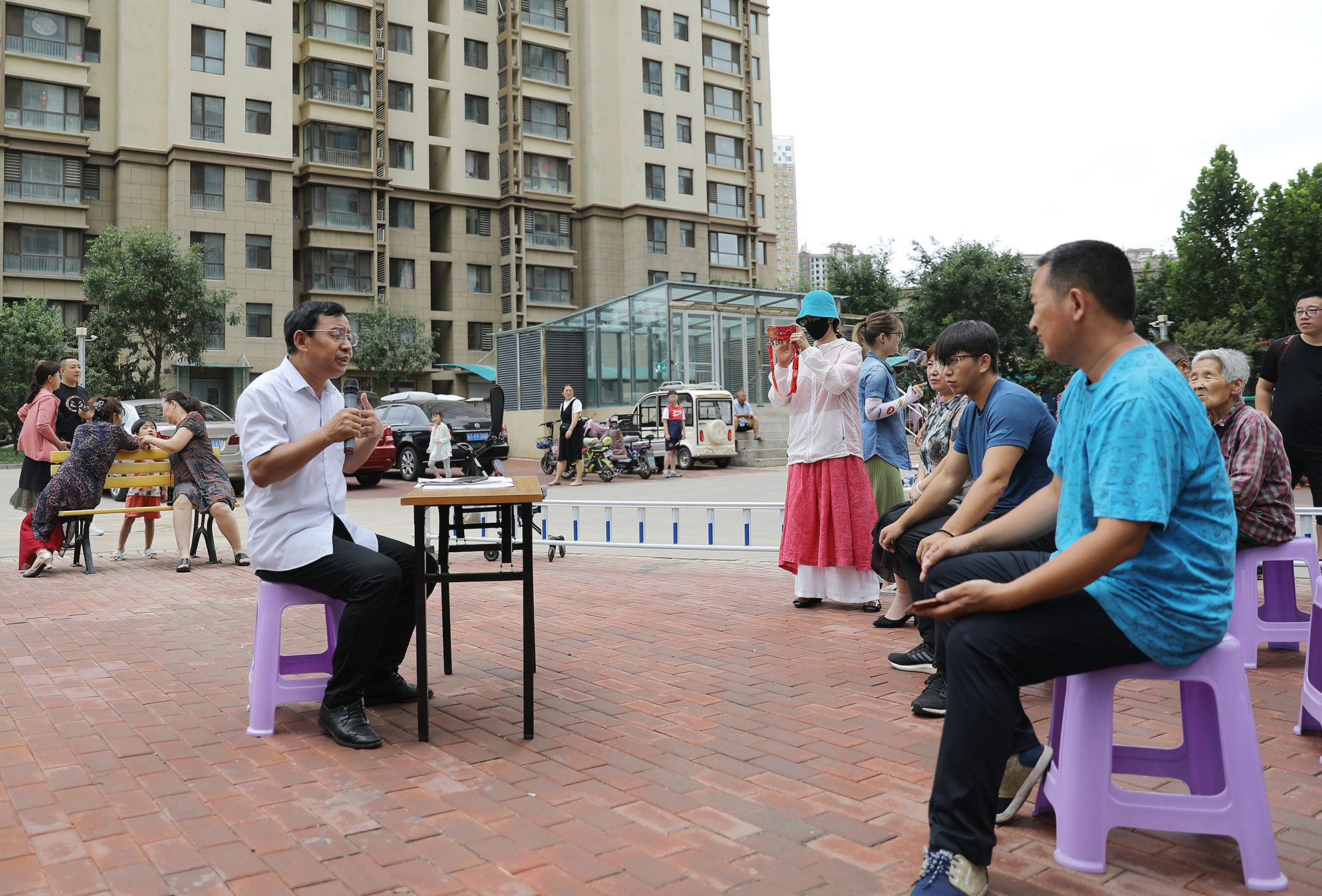 7月12日,在桃城區河東街道辦事處橋東社區依云灣小區廣場,居民們坐在板凳上,圍在黨史宣講員井朝順身傍,聽著他生動樸實地講述著黨史故事,不時地爆發出陣陣掌聲。