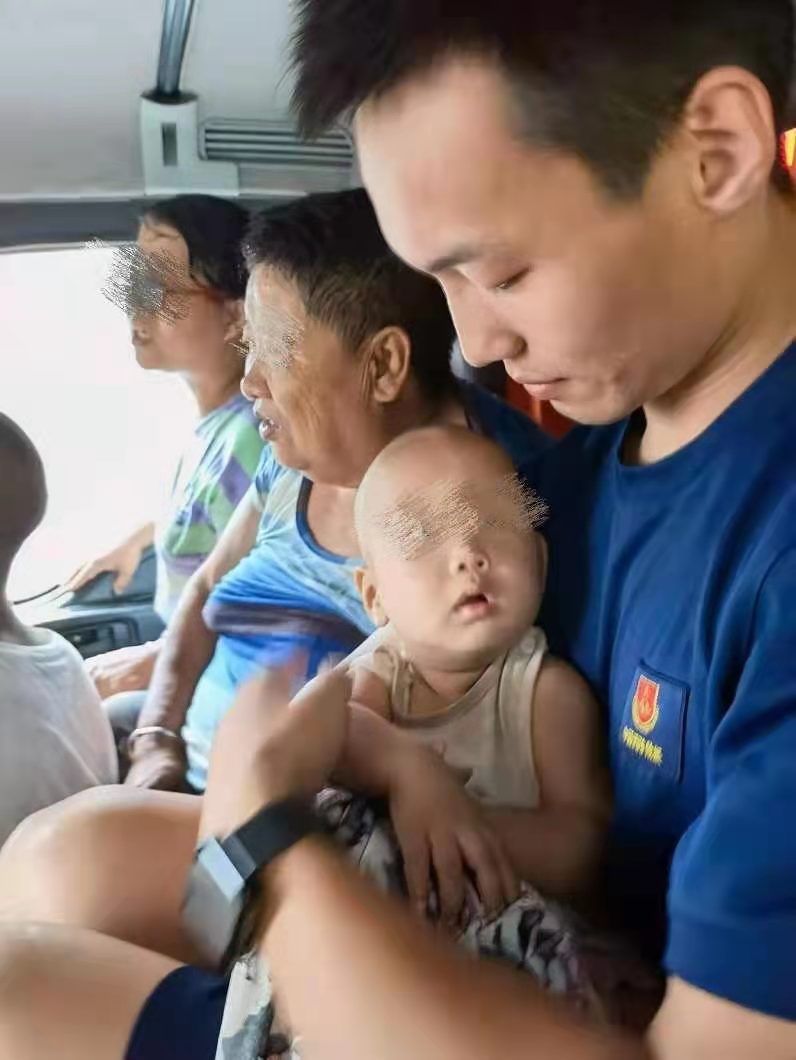 暴雨如注,事發現場道路積水深達50厘米,三輪車被困于積水內,無法移動。車上有不足一周的嬰兒,還有白發蒼蒼的老人,狹小空間內,老人和孩子抱作一團,不時有雨水打進,情況十分危急。指揮員迅速下達作戰命令:第一小組負責救助被困人員,第二小組對過往車輛和人員進行安全提示,并實時待命。救援人員首先將嬰兒轉移至消防車上,交由消防員照看,隨后冒雨將車上的老人攙扶到消防車旁,并抬上消防車。由于雨勢較大、路面積水較多,救援人員將被困一家暫時安置在消防站,并準備了飲用水和毛巾等物品,讓他們安心等待,直到恢復交通后才將一家人送走。