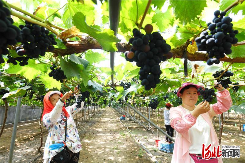 7月14日,懷來縣土木鎮西辛堡村村民朱建平、李淑萍在葡萄園里采摘葡萄。 通訊員孫慧軍攝
