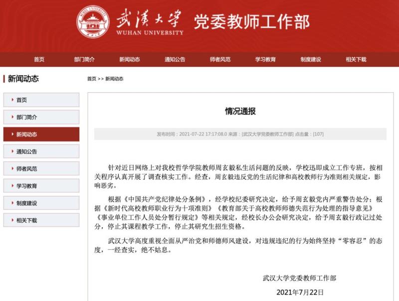 針對(duì)近日網(wǎng)絡(luò)上對(duì)武漢大學(xué)哲學(xué)學(xué)院教師周玄毅私生活問題的反映,武漢大學(xué)回應(yīng),學(xué)校迅即成立工作專班,按相關(guān)程序認(rèn)真開展了調(diào)查核實(shí)工作。經(jīng)查,周玄毅違反黨的生活紀(jì)律和高校教師行為準(zhǔn)則相關(guān)規(guī)定,影響惡劣。
