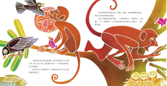 這是一則句式不斷重復(fù),故事情節(jié)不斷推進(jìn)的非洲民間故事。一天,蚊子向鬣蜥吹了個(gè)小牛皮,鬣蜥不想聽(tīng)小蚊子唧唧歪歪,就找了一根棍子把耳朵塞住;蟒蛇和鬣蜥打招呼,但鬣蜥沒(méi)聽(tīng)見(jiàn),蟒蛇以為鬣蜥生氣了,于是他沖進(jìn)小兔子的窩;小兔子慌了,四處跑起來(lái),烏鴉看到小兔子以為發(fā)生了什么大事……就這樣雪球越滾越大,竟引起了一起驚天動(dòng)地的大災(zāi)難,最后還好有獅王出來(lái)主持公道,原來(lái)最初就是蚊子的嗡嗡叫。類似這樣環(huán)環(huán)相扣的故事還有《母雞蘿絲去散步》。