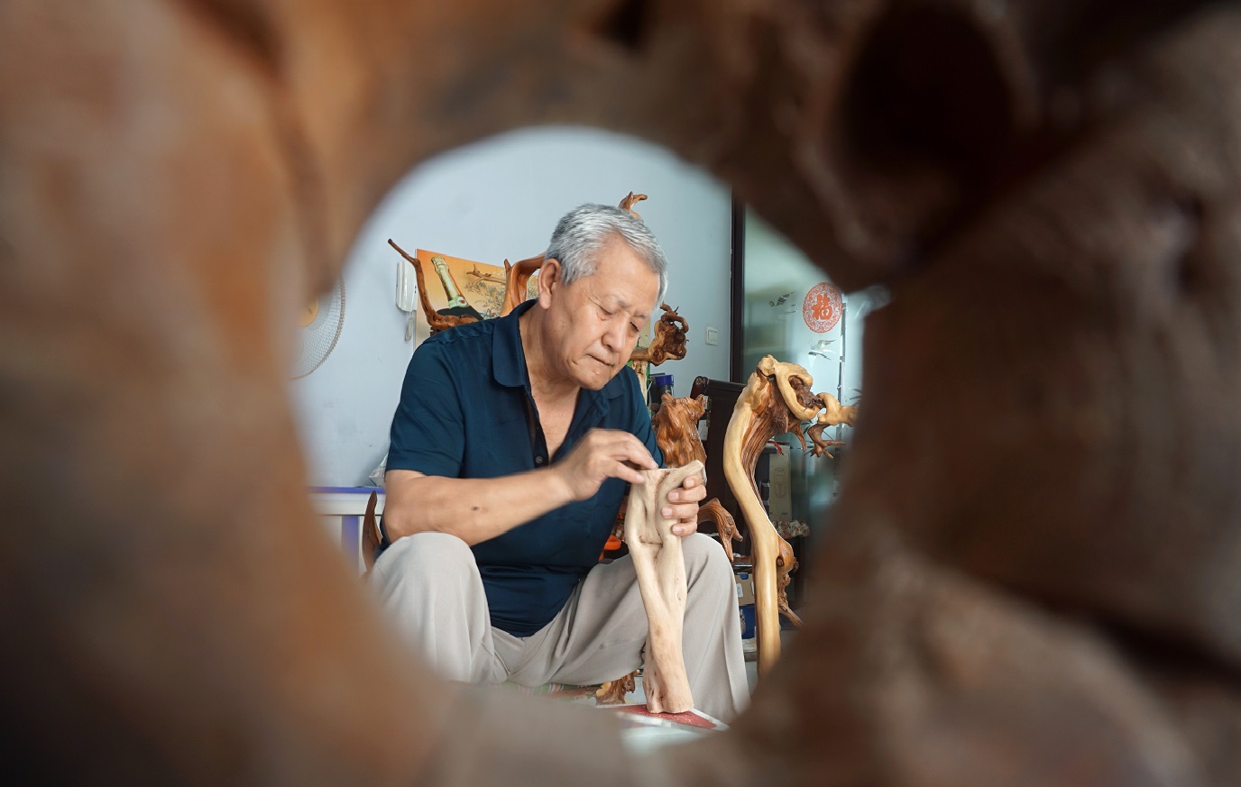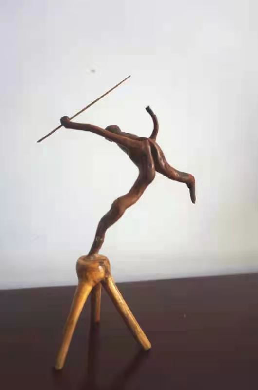 談起最初與根雕結緣,李學芳記憶猶新。“退休前,我在園林處是一名園藝師,主要負責花草種植工作。”李學芳說,有一次,他和工人一起刨樹,突然被一個小小的樹根深深吸引住。打量一番后,他越發覺得這個樹根長得很有意思,于是便拾起來帶回家中。他對著小樹根端詳數日,終于開始在它身上動刀。沒多久,一個高約4厘米,手拿標槍的運動員根雕作品誕生。李學芳非常開心,覺得很有成就感,同時對根雕的熱愛一發不可收拾。