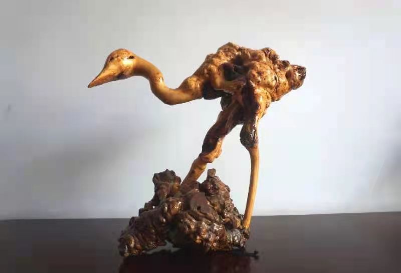 每次回老家走親戚,李學芳都會留心村頭的柴火堆,只要發現有用的樹根就把它帶回家。樹根帶回家后,李學芳會費心琢磨這個樹根到底像什么、雕成什么最好,“這一琢磨,往往好幾天睡不著覺。”李學芳指著桌子上一件伸著長長的脖子、形似奔跑的丹頂鶴的根雕作品說,這個樹根發現時本身就是一件藝術品,拿到手后,他不管是吃飯、睡覺,總是對著樹根反復觀察揣摩。靈感迸發后,打磨、雕刻、上漆……經過一個多月雕琢,一只形神兼備的丹頂鶴順應而生。