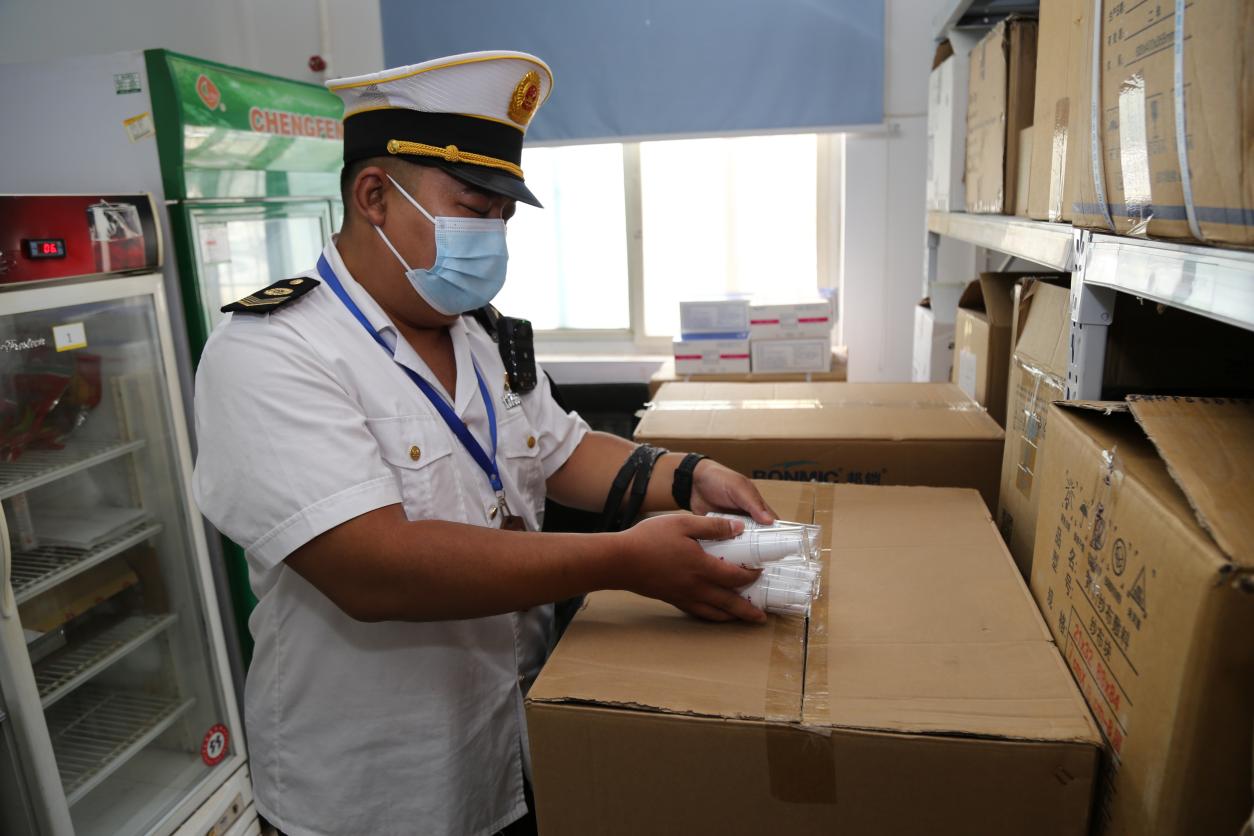 市衛(wèi)生健康委監(jiān)督執(zhí)法人員在冀衡集團對抽檢的消毒液進行采樣登記。
