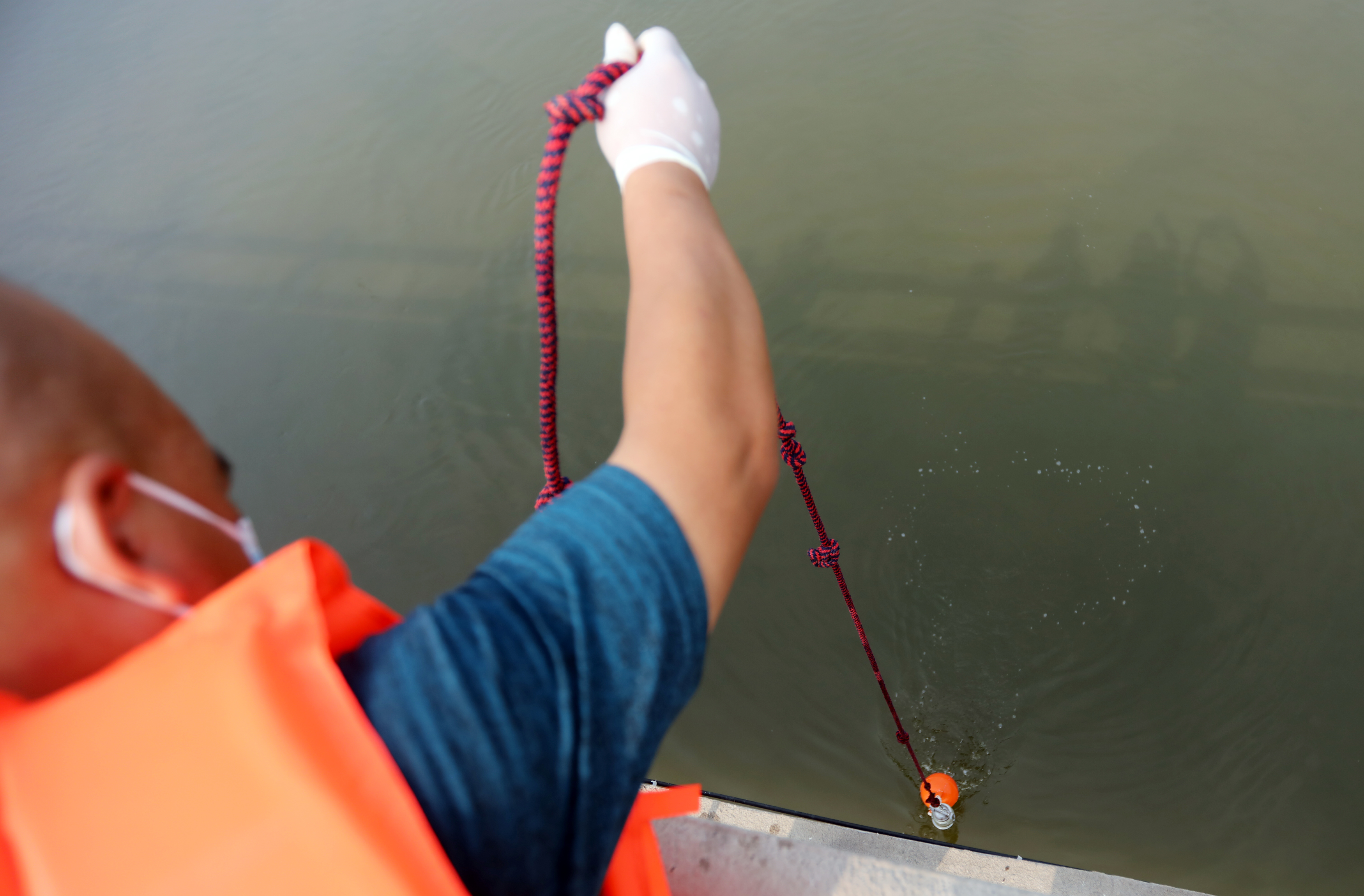 取樣人員在岸邊搭起簡易工作臺。