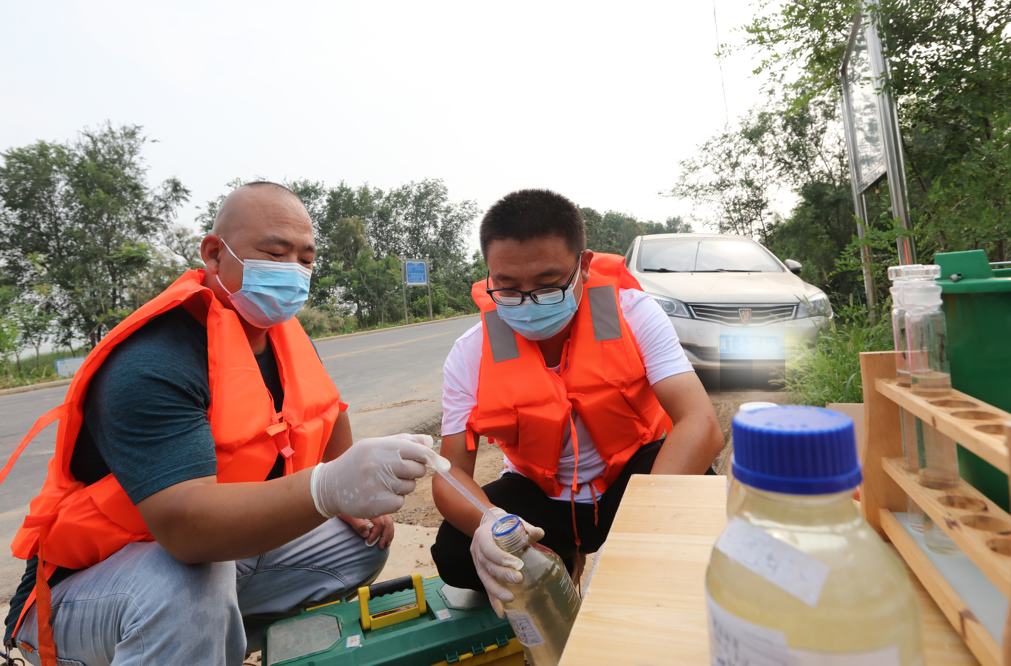 8月4日下午,天氣異常悶熱。在衡水市桃城區與濱湖新區交界處的滏東排河橋上,兩名市環境監控中心工作人員正在進行河流斷面水質監測現場取樣工作。在他們工作車的后備箱里,裝著許多用來裝樣品的瓶瓶罐罐。