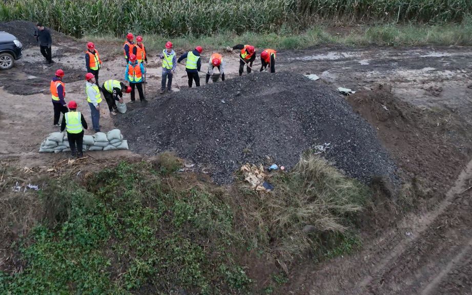 武強(qiáng)縣閆五門村和劉五門村黨員修整通往防汛一線的道路。周云騰 攝