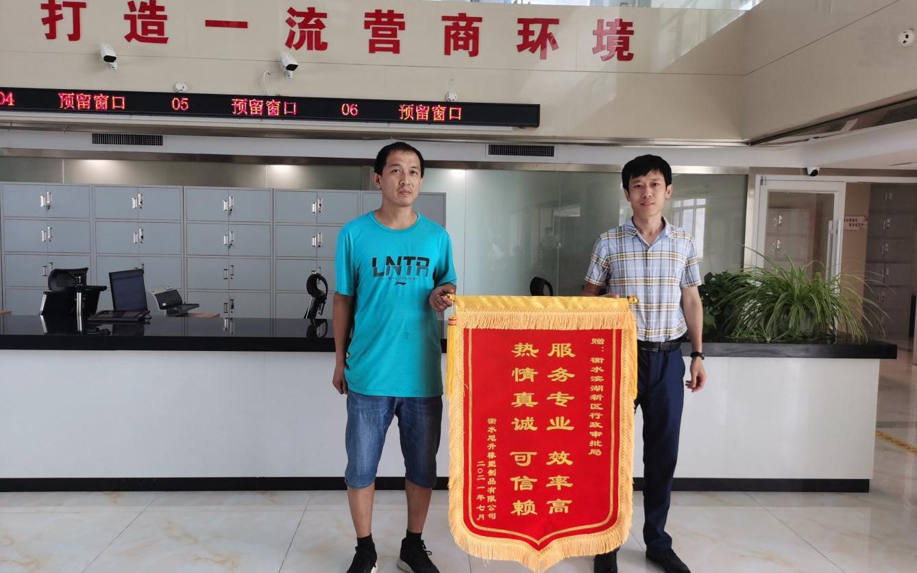 近日,衡水旭升橡塑制品有限公司制作一面寫有“服務專業效率高,熱情真誠可信賴”的錦旗送至濱湖新區行政審批局,對工作人員優質高效的服務表達感謝。