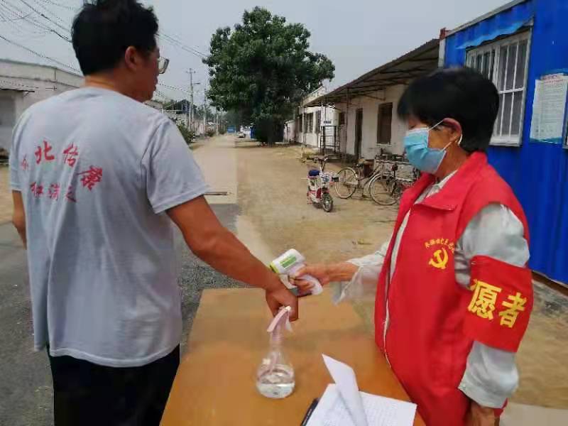 8月13日上午,在寺宅城村村口疫情執(zhí)勤點(diǎn),身穿志愿者紅馬甲、佩戴黨徽的何存青正在為進(jìn)村人員認(rèn)真測(cè)量體溫、登記相關(guān)信息,當(dāng)天不是她值班的時(shí)間,聽(tīng)說(shuō)一位志愿者有事兒需要換班,何存青一大早就來(lái)到執(zhí)勤點(diǎn)替班。