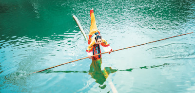 楊柳身穿苗族服飾在浮于水面的竹竿上起舞。