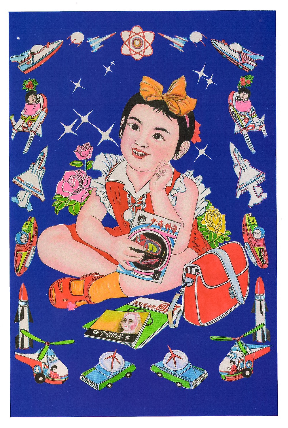 這幅年畫作品中,小女孩一邊興致勃勃地翻看科學書籍,一邊想象著將來要用所學知識實現自己的航天夢。這幅年畫以少年兒童的視角,反映出科學教育已經在他們心中生根發芽,引導少年兒童從小樹立遠大理想、立志肩負起民族復興的時代重任。
