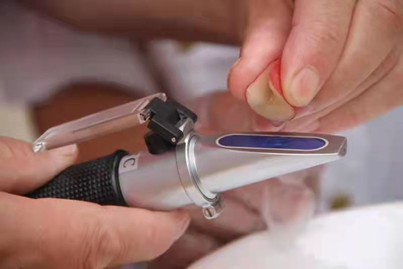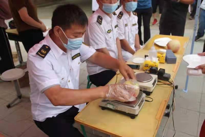 本次大賽以評選高品質蜜桃為宗旨,將蜜桃色澤口感、質量、含糖量等作為評比標準,其中含糖量由工作人員通過專業儀器測試,蜜桃的色澤、外觀和口感通過7位評委現場打分,最后將各項評分相加,總分最高者即為“桃王”。經過評委、稱重組、測糖組等工作人員兩個多小時的測評,最終評選出一等獎1名,二等獎3名,三等獎5名。