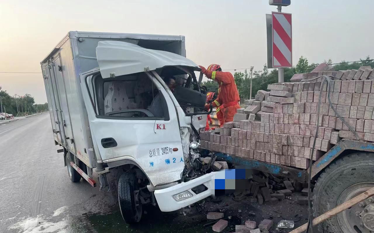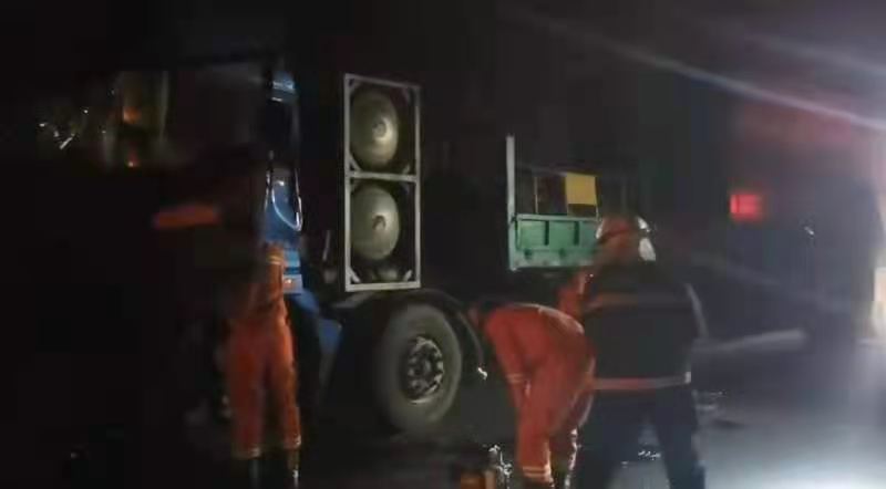 救援人員到達現場后,經勘查和向報警人詢問了解到,事故現場為兩輛貨車追尾,事發時前車行至紅綠燈處停車,滿載鋼材的后車在巨大慣性下,緊急制動不及時,追尾前車,駕駛室被所拉鋼板頂翻,車頭朝下,情況危急。