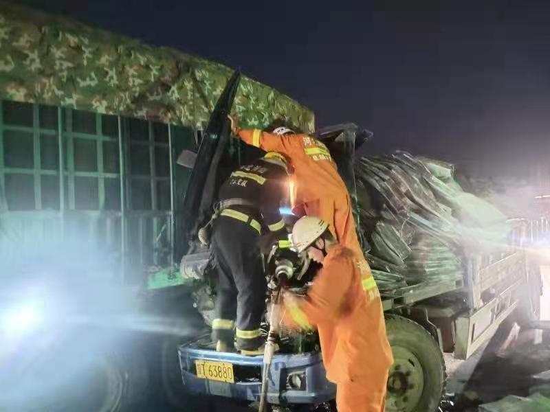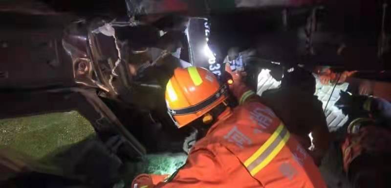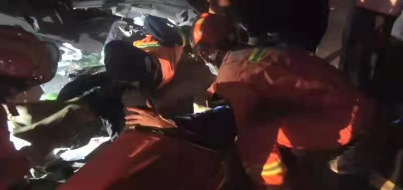 指揮員立即下令展開救援。救援人員首先破拆副駕駛車門,約10分鐘左右將被困副駕駛人員救出,交由醫護人員。隨后使用擴張器、液壓頂桿,營救被困駕駛員。因車頭變形朝下,無法確定被困人員腿部情況,指戰員遂指揮吊車將車頭吊起,2名救援人員蹲在車下,支撐住被困人員,其余救援人員進一步破拆頂撐,終于將被困駕駛員成功救出,交由現場醫護人員處理。
