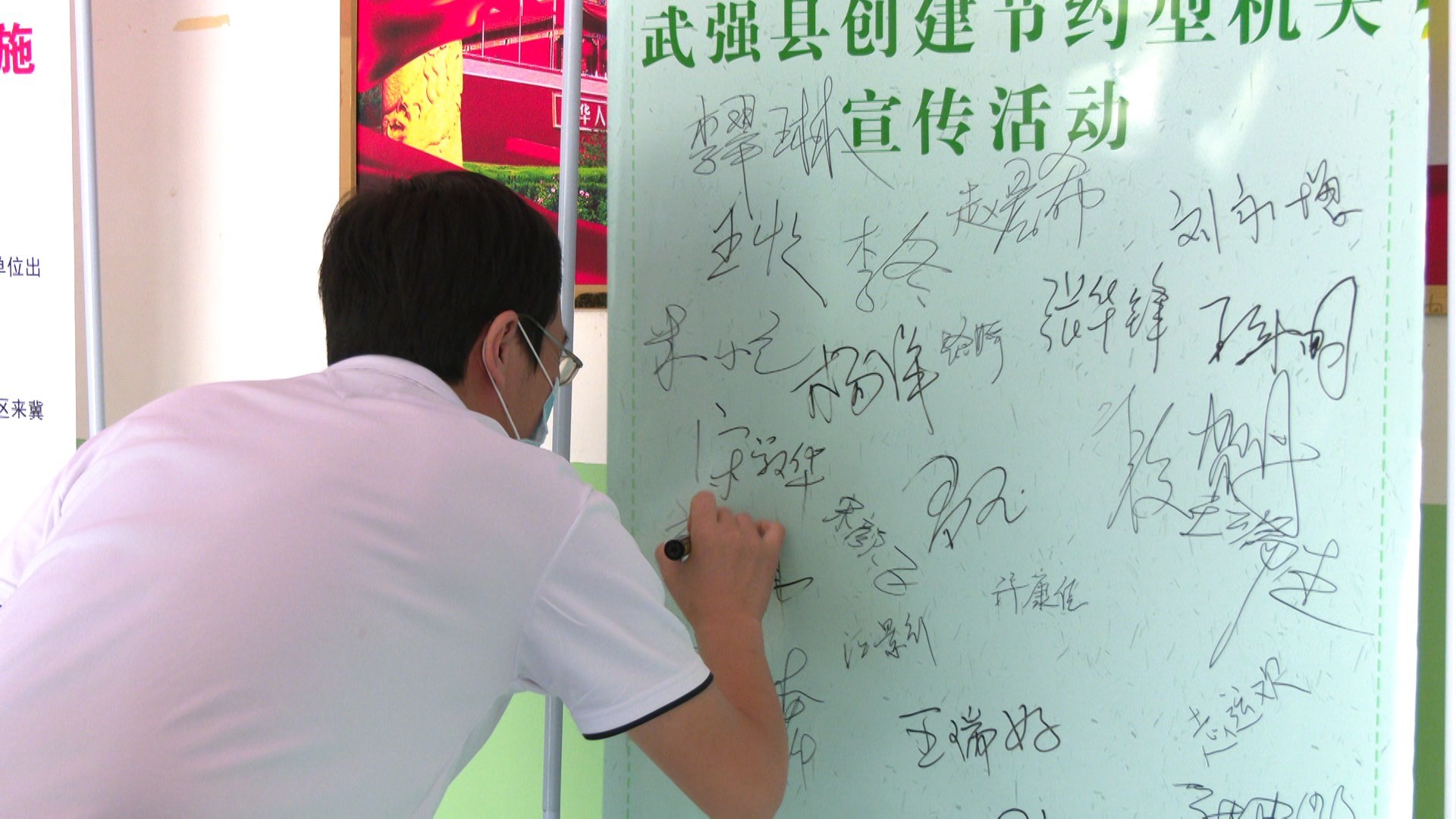武強縣開展創(chuàng)建節(jié)約型機關(guān)宣傳活動,參與人員在簽名板上簽名。張晉兵 攝