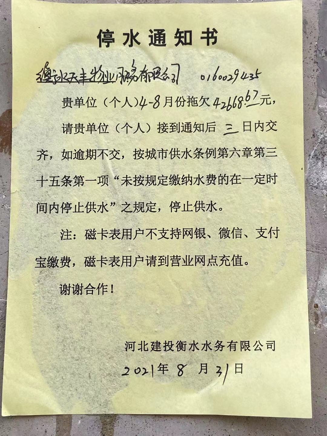 居民向記者展示了8月31日河北建投衡水水務(wù)有限公司在小區(qū)張貼的停水通知,上面寫(xiě)道:天豐物業(yè)公司4-8月份拖欠42668.67元,在接到通知后三天內(nèi)交齊,如逾期不交,按城市供水條例第六章第三十五條第一項(xiàng)“未按規(guī)定繳納水費(fèi)的在一定時(shí)間內(nèi)停止供水”之規(guī)定,停止供水。