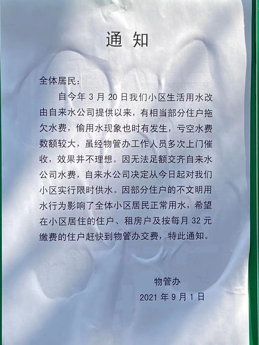 在小區(qū)各單元前,記者看到物業(yè)公司9月1日張貼的通知,上面寫(xiě)道:“自3月20日小區(qū)生活用水改由水務(wù)公司提供以來(lái),有相當(dāng)部分住戶(hù)拖欠水費(fèi),偷用水現(xiàn)象也時(shí)有發(fā)生,虧空水費(fèi)數(shù)額較大,雖經(jīng)物管辦工作人員多次上門(mén)催收,效果并不理想。因無(wú)法足額交齊自來(lái)水費(fèi),水務(wù)公司決定對(duì)小區(qū)實(shí)行限時(shí)供水。因部分住戶(hù)的不文明用水行為影響了全體小區(qū)居民正常用水,希望在小區(qū)居住的住戶(hù)趕快到物管辦繳費(fèi)。”