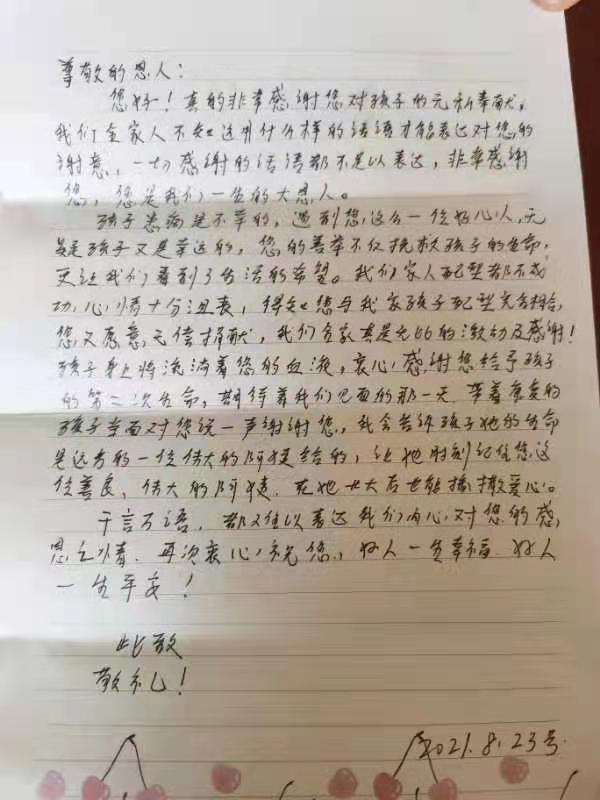 捐獻(xiàn)完成后,她收到了醫(yī)生送上的被救助孩子家長(zhǎng)親手寫的感謝信。信中寫道:您的善舉不僅挽救了孩子的生命,更讓我們看到了生活的希望。孩子身上將流淌著您的血液,衷心感謝您給予孩子第二次生命,期待我們見(jiàn)面的那一天!捧著信紙,馮雪留下了熱淚。“醫(yī)生說(shuō)讓我修養(yǎng)兩天再走,但得知捐獻(xiàn)期間所有食宿由被救助家庭承擔(dān)后,我立刻返程了。這家人為救治孩子應(yīng)該花了不少錢,我不能再給人家增添負(fù)擔(dān)。”善良的馮雪總是處處為他人著想。