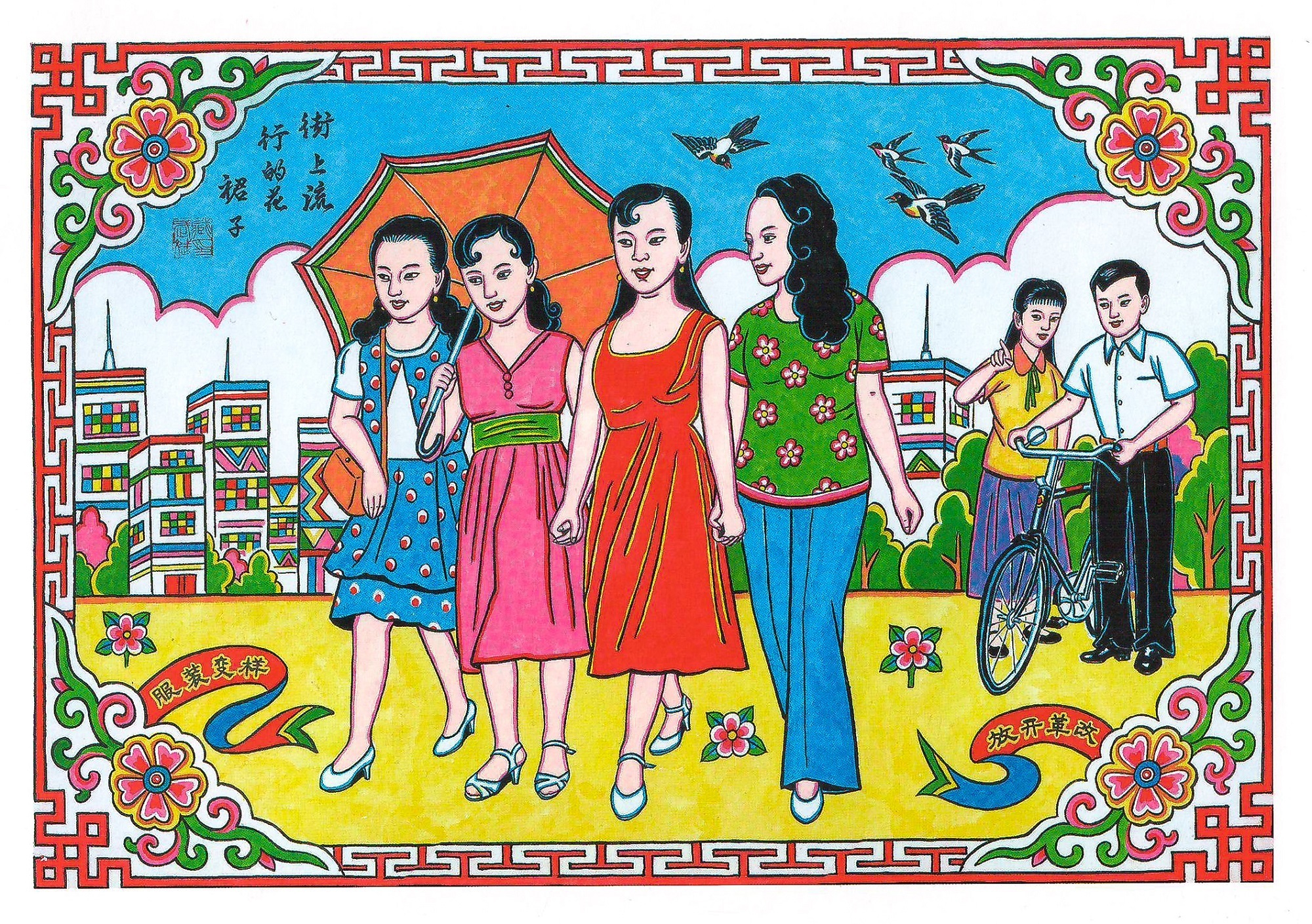 這幅武強(qiáng)年畫描繪的是改革開放初期,隨著經(jīng)濟(jì)社會(huì)不斷發(fā)展,人民生活得到改善,很多新鮮事物也逐漸涌入人們的日常生活,一些愛美的女士紛紛穿上連衣裙、喇叭褲、高跟鞋等新穎美觀的服飾,燙起了時(shí)尚的卷發(fā)。這幅年畫選取社會(huì)生活的一個(gè)側(cè)面,記錄了服飾的變遷,反映出時(shí)代進(jìn)步和人們觀念的轉(zhuǎn)變。
