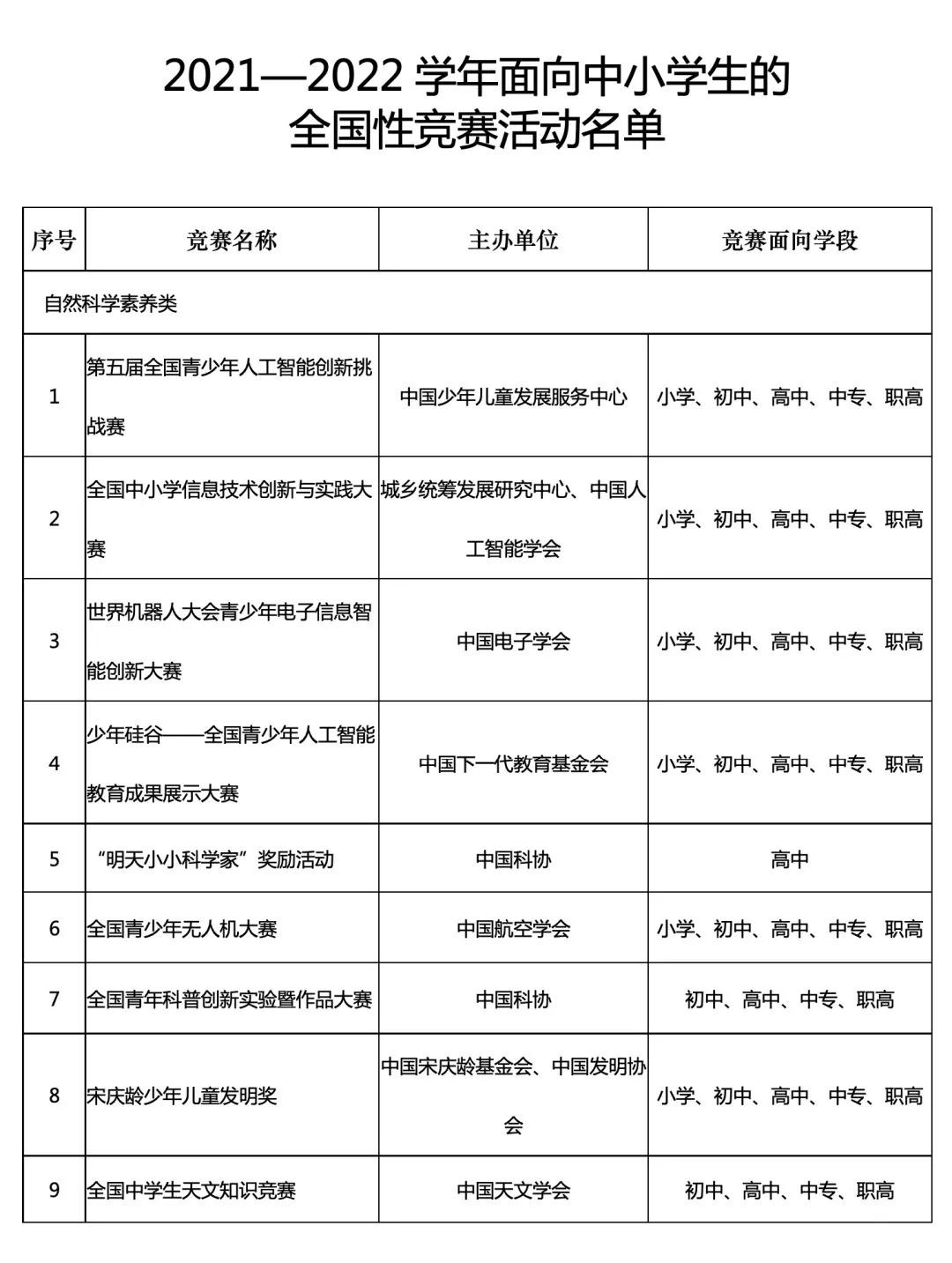 教育部官網發布《教育部辦公廳關于公布2021—2022學年面向中小學生的全國性競賽活動的通知》,確定“第五屆全國青少年人工智能創新挑戰賽”等36項競賽活動為2021—2022學年面向中小學生的全國性競賽活動,舉辦時間原則上為2022年8月前。