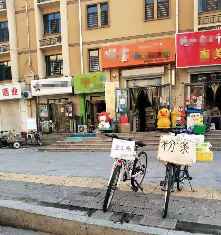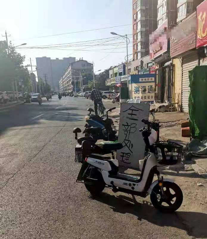 4時許,在站前西路與育才南大街交叉口往西約200米處,記者又見到了在便道私設廣告牌的現象。只見路北側,一家服裝店門口,在一輛電動車旁豎立著一張大約一米多長、寬約50厘米的手寫廣告牌,上面寫著“全部處理”字樣,顯然是商家為了招攬生意而放的。此時,在這家服裝店的斜對面便道上,有兩輛停在盲道上的自行車,車把上分別用繩子掛著“衛生紙”“粉條”等字牌,不僅影響了盲人的通行,且十分“煞風景”。