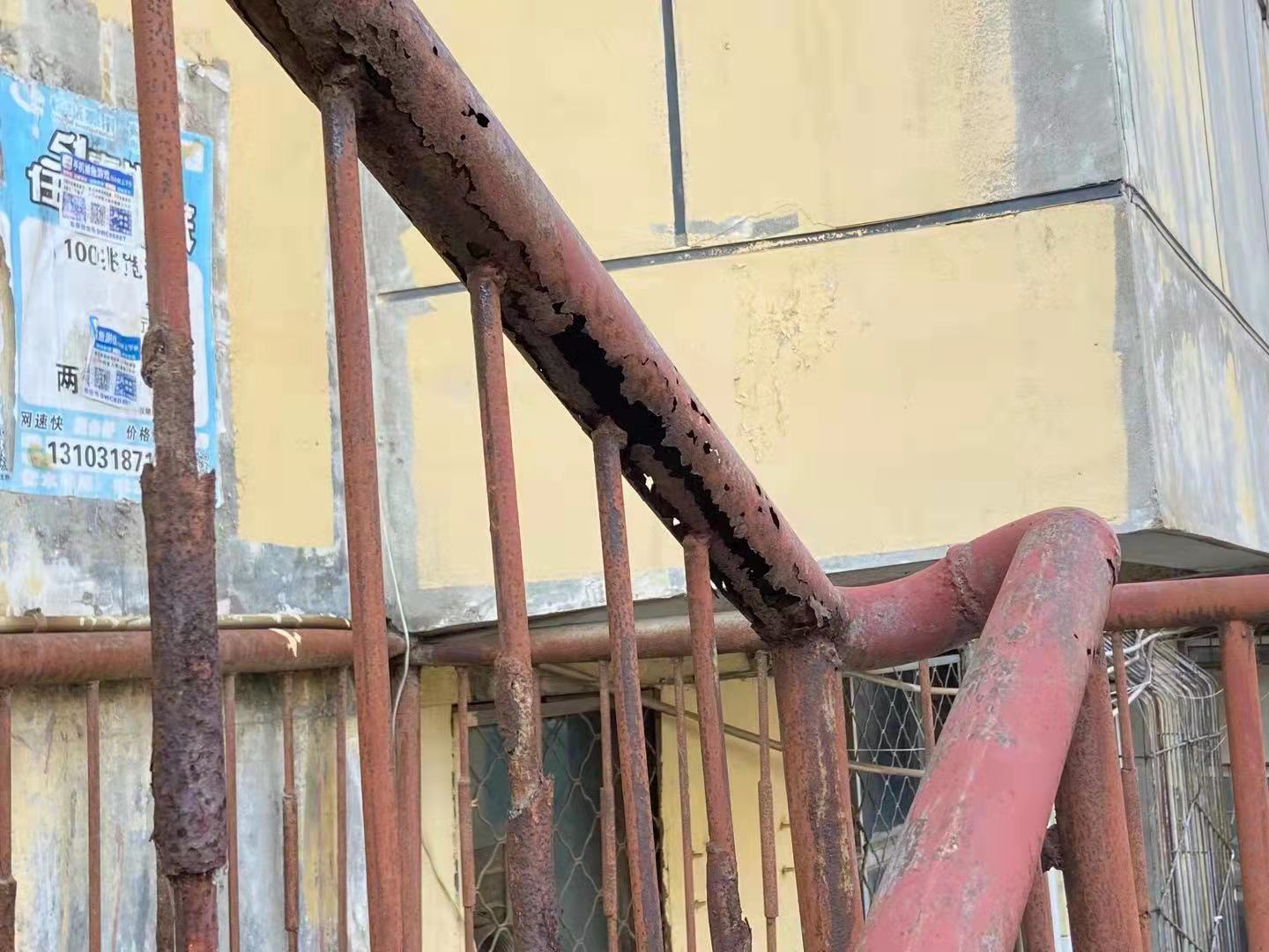15日上午,記者來到服裝廠生活區實地走訪。居民反映問題最多的是小區門口的新三號樓,共有50多戶居民。記者看到,新三號樓的一樓為沿街門店,居民回家要沿著樓外的臺階上二樓進單元門,可臺階上的護欄銹跡斑斑,很多地方甚至已經被腐蝕呈鏤空狀,扶手和下面的護欄有的已經分離,用手一推便搖搖晃晃,“這護欄稍一用力就能推倒,老人孩子上樓都不敢扶一下,太危險了!”居民張先生抱怨道。