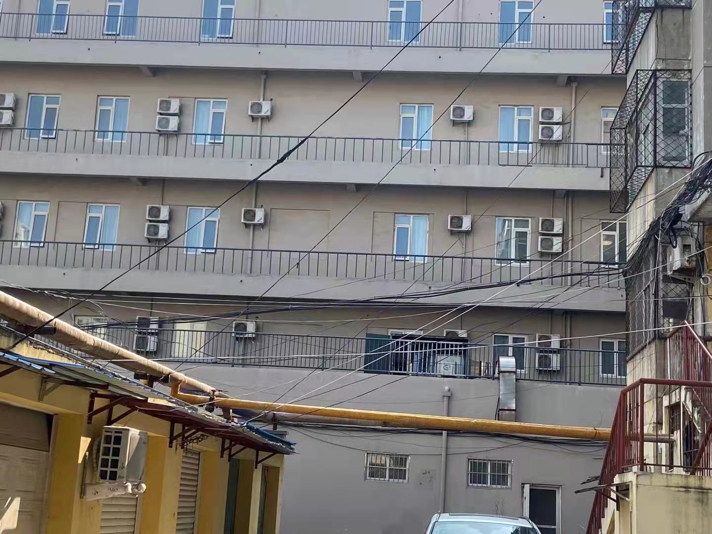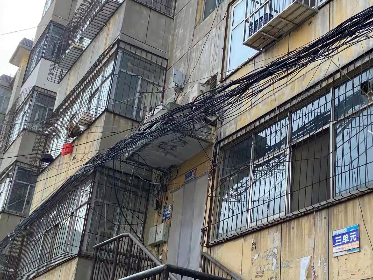 在新三號樓對面是一排車庫,車庫上方一根根從居民家中拉出的電線像蜘蛛網一樣盤旋在半空中,居民介紹,小區其他幾幢樓的小房、車庫都通了電,只有新三號樓的車庫小房沒通電,居民沒辦法,只能自己從家中拉電線下來。