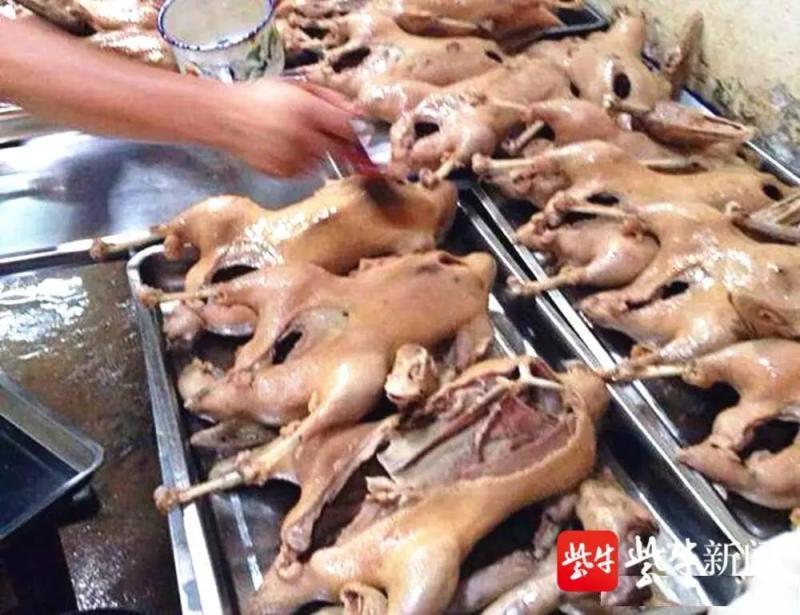 記者了解到,老鵝在揚州傳統特色菜肴中占有重要地位,相較于紅燒食用的鵝肉,揚州人口中的“老鵝”,一般指鹵制成熟食的鹽水鵝。老鵝既可以在飯店當冷菜,更是家中一道主食。一年四季,漫步揚州街頭巷尾,賣老鵝的熟食攤點隨處可見。攤點上,老鵝分開賣,價格不同,通常分為鵝頭(連著頸部)、鵝肉、鵝爪、鵝翅、鵝肫、鵝肝、鵝腸和鵝血。當你選好所要的鵝的部位以后,老板會從廚柜中拿出一只內臟掏空的整鵝放在案板上,首先一刀從頸部下去,把鵝頭和鵝身分開,再將鵝從胸膛部位一分為二,隨便你要半邊、前夾或后夾,伴隨著“篤篤篤”的有節奏斬剁聲,老板會刀刀精準、毫不拖泥帶水地剁成大小差不多的鵝肉塊,隨即裝進食品袋或食品盒,淋上鵝油,澆上老鵝鹵汁,交給食客。