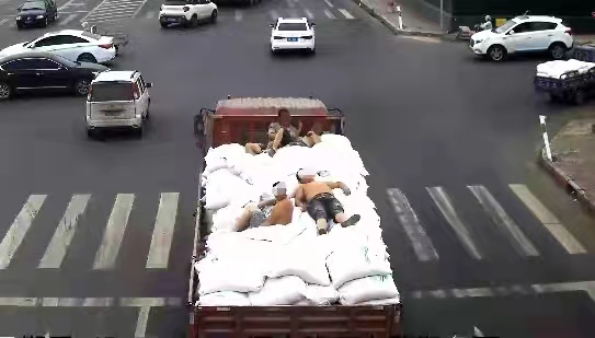 根據追蹤,執勤民警于15時42分左右將該車攔停,并責令貨物上躺著的4名男子下車。據駕駛人交待,車上都是裝卸工,他們剛剛將貨物裝到這輛車上,為了圖省事不想再租車返回,心想貨物足夠高,路面執勤民警根本看不到上面,就冒險躺在貨物上,僥幸上路,結果被視頻巡邏查個正著。