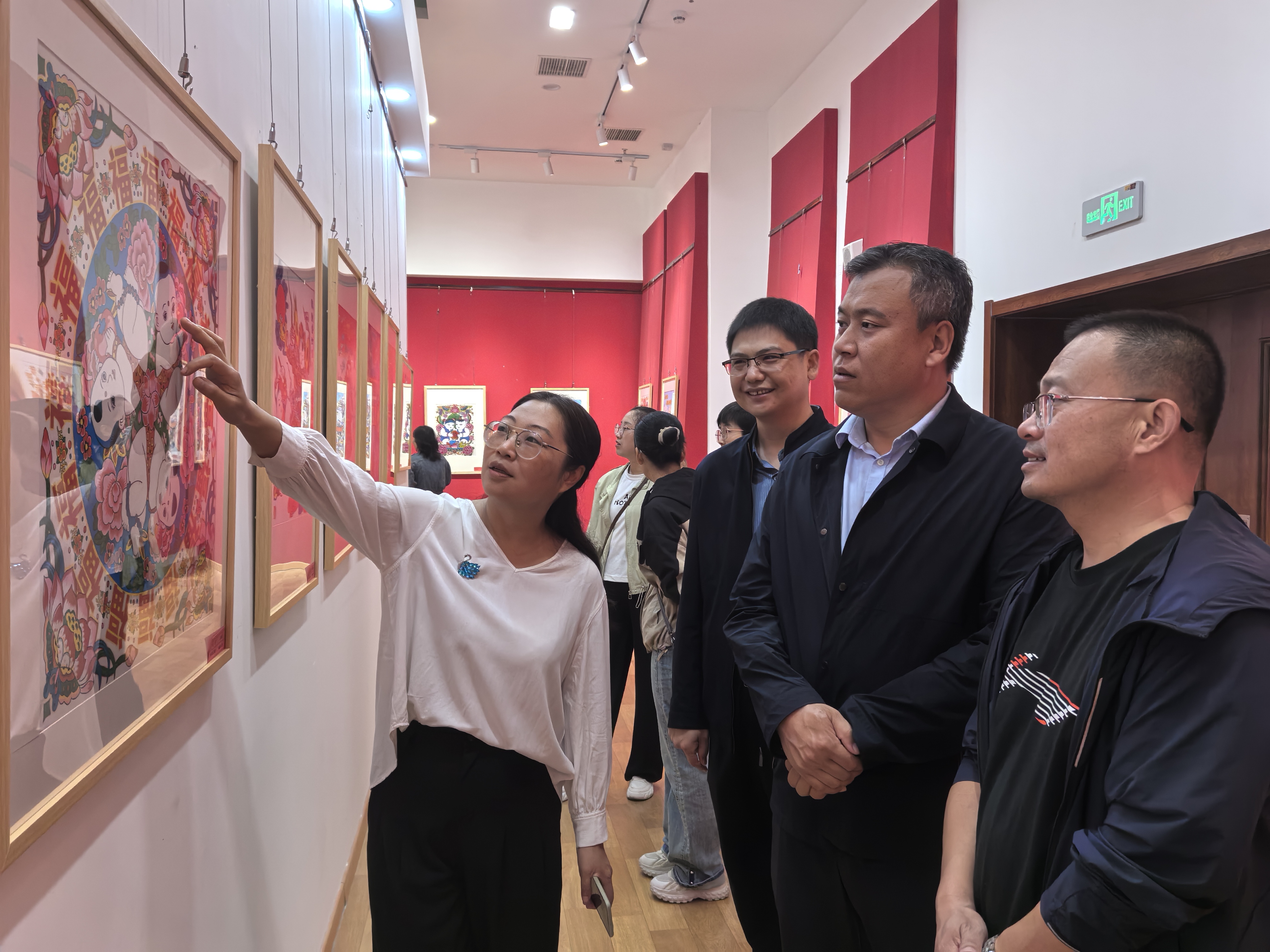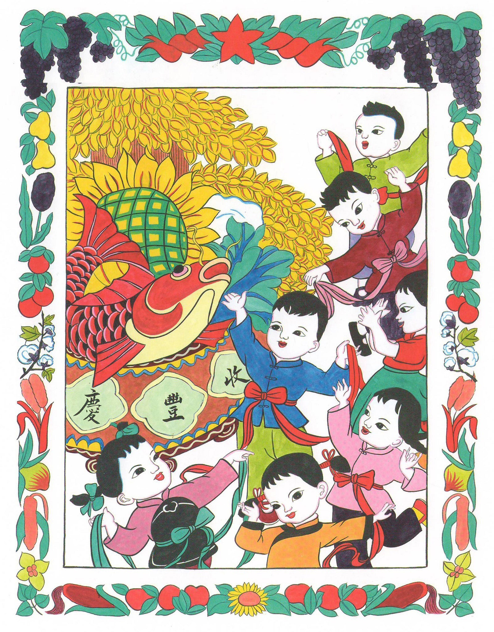 武強年畫作品《慶豐收》描繪了金秋時節,農民圍著收獲的果實載歌載舞的熱鬧場面。整幅年畫人物造型豐滿、色彩艷麗濃郁,傳遞出豐收的喜悅,寄托著農民對美好生活的向往。