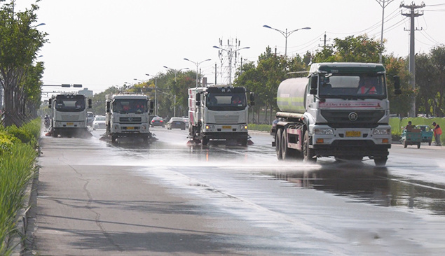 在城區各主、次干道,集中組織多功能抑塵車、灑水車、多功能洗掃車等進行沖洗清掃,并對道路兩旁的綠化帶、公交站牌等進行全面清洗。此次環境衛生提升行動,拉長了環衛清掃作業時間,增加了作業頻次,確保以整潔、有序的城市容貌喜迎雙節。
