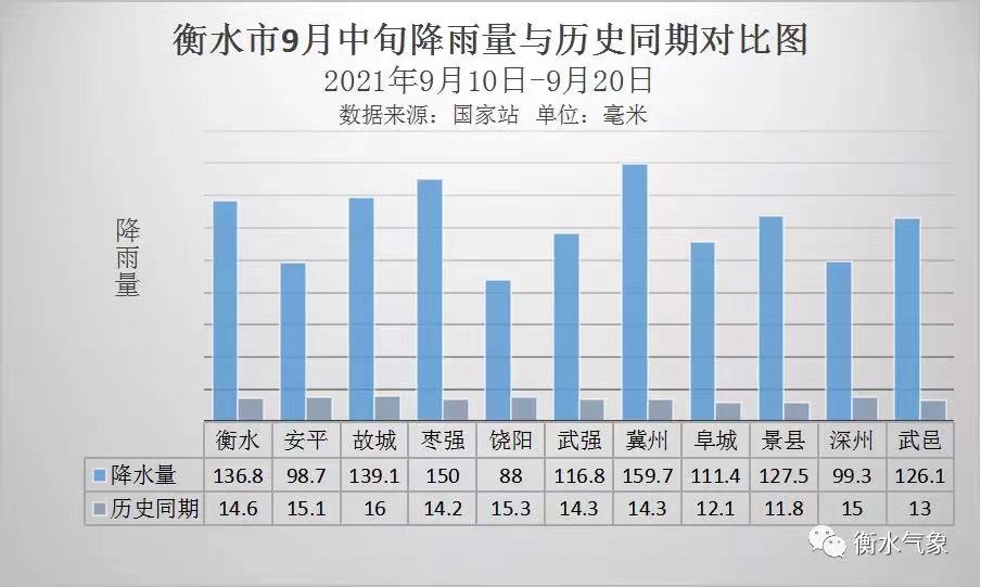 衡水市氣象臺發布9月中旬,9月中旬全市平均氣溫較常年偏高1.8℃,平均降水量較常年偏多8.7倍。