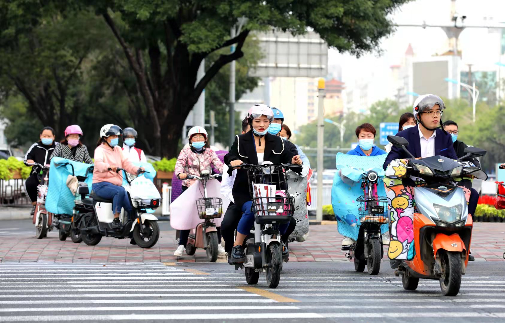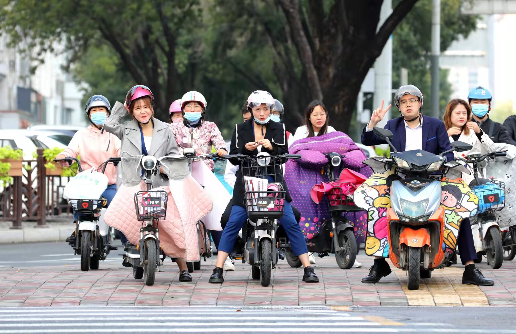 當(dāng)日上午10時(shí)許,在主城區(qū)人民路與紅旗大街交叉口,記者看到,非機(jī)動(dòng)車通行秩序井然,在電動(dòng)車騎行隊(duì)伍中,半數(shù)以上的人都佩戴著頭盔,有的市民不僅自己按規(guī)定佩戴頭盔,還為同乘人員也配備了頭盔。