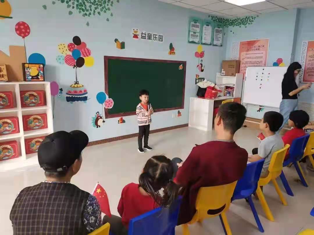 活動現(xiàn)場,孩子們手中的小國旗和臉上的國旗貼紙渲染了喜氣洋洋的國慶氛圍,開場的破冰游戲活躍了現(xiàn)場的氣氛,破解少年兒童彼此的陌生感,社工引導(dǎo)孩子們了解國慶節(jié)的由來、節(jié)日的意義,“我國國歌、國旗的名稱是什么?”“我國國徽的內(nèi)容是什么?”等內(nèi)容?;顒蝇F(xiàn)場充滿了歡聲笑語,其樂融融,每個人臉上都洋溢著自信的笑容。隨后小朋友們紛紛上臺表演了節(jié)目,將本次活動的氣氛推向最高潮,參與表演的每一位小朋友都獲得了一張獎狀。最后,伴隨著孩子們合唱《歌唱祖國》,結(jié)束了本次活動。