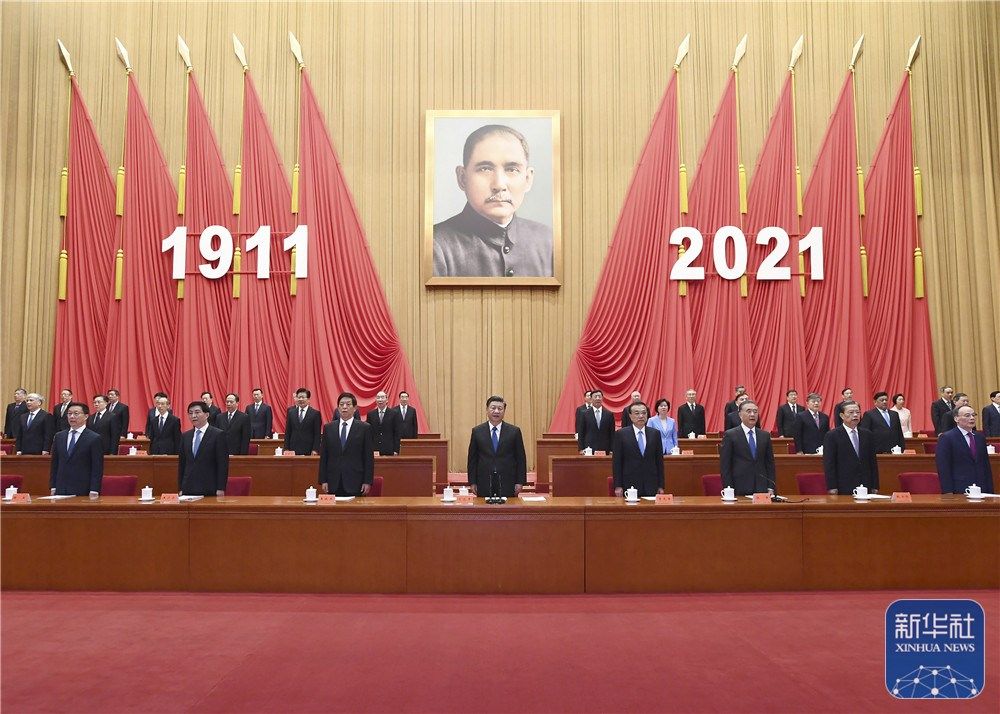 人民大會堂大禮堂氣氛莊重熱烈。主席臺上方懸掛著“紀念辛亥革命110周年大會”會標,后幕正中是孫中山先生畫像,10面紅旗分列兩側,上面懸掛的“1911”“2021”字標格外醒目。
