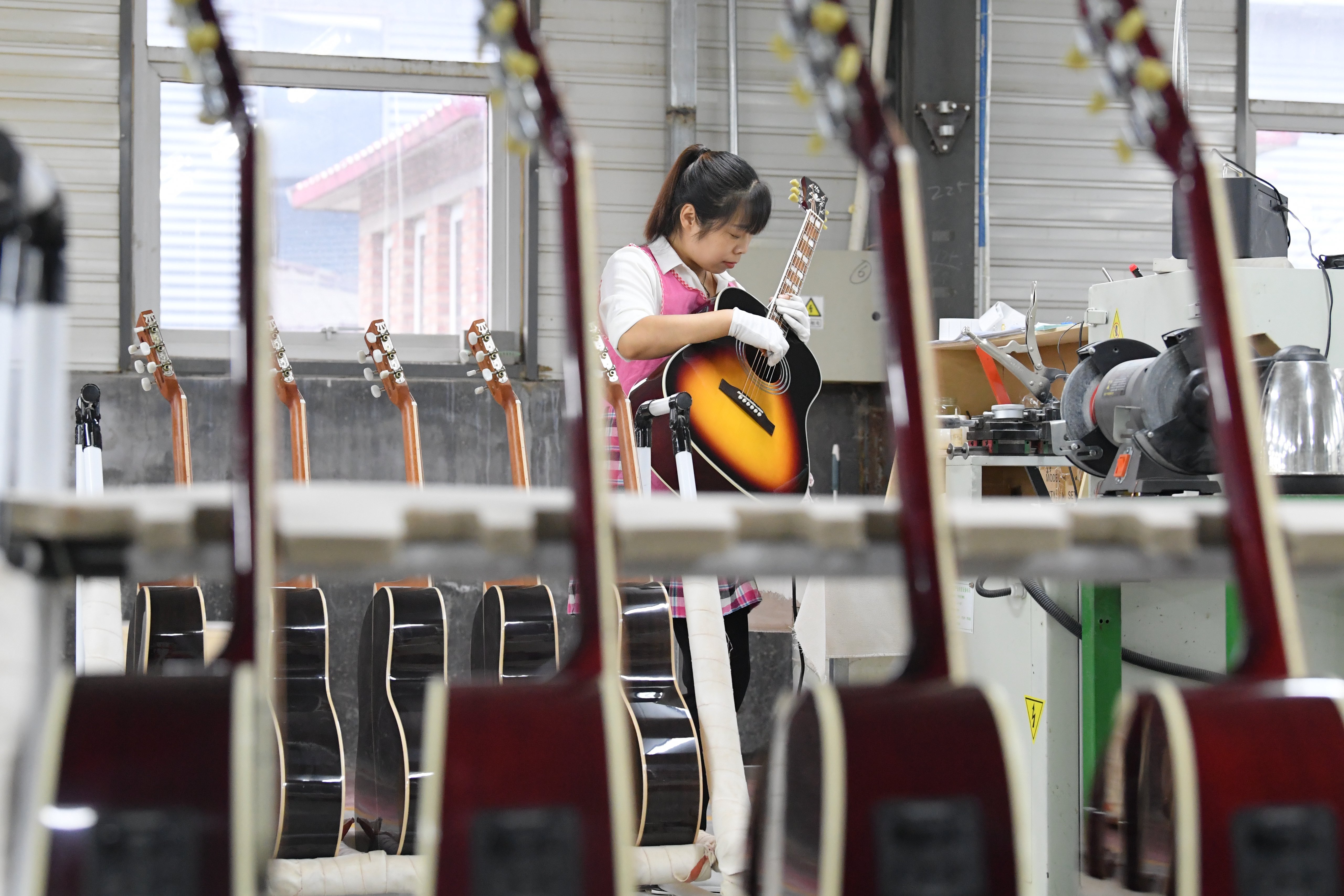 樂器企業(yè)工人給吉他調(diào)音。蘇小立 攝