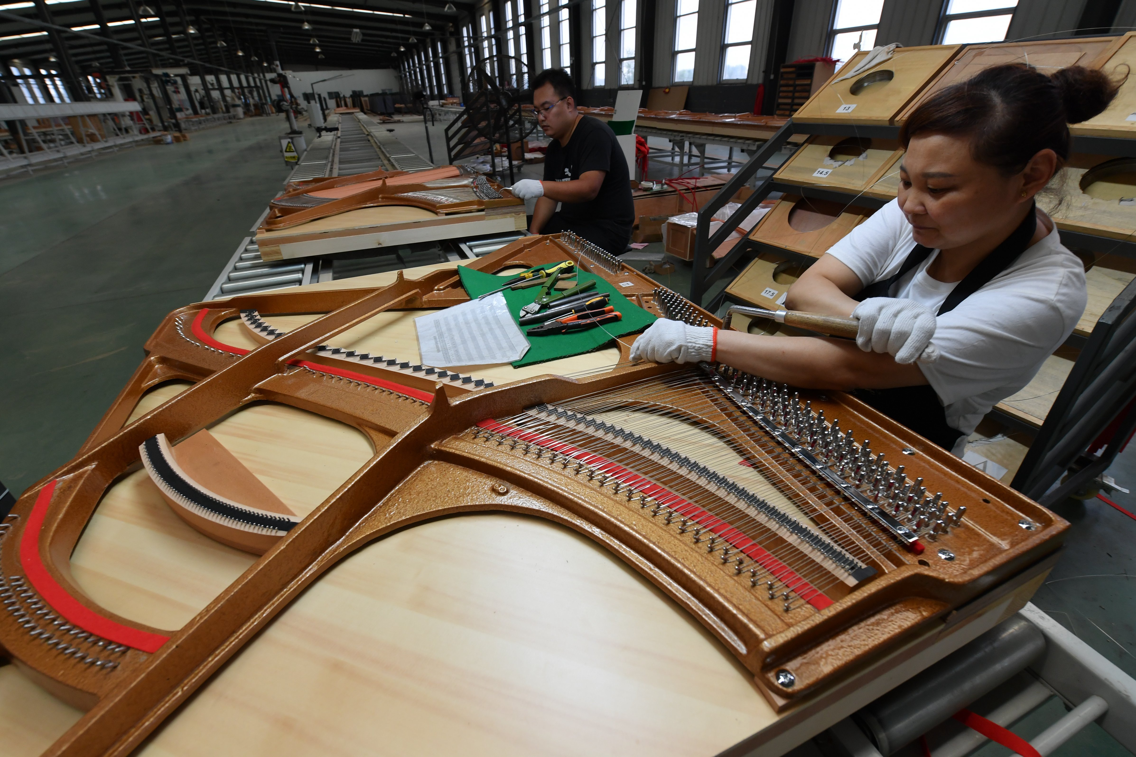 樂器企業(yè)工人給鋼琴掛弦。蘇小立 攝