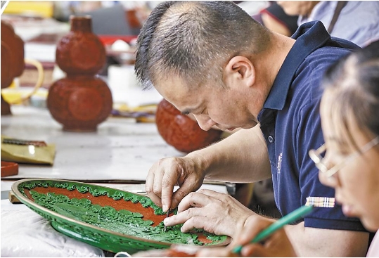 “布雕畫完全不用剪刀剪成圖案,而是運用特制的電烙鐵把布料雕刻成書畫藝術品。溫度過高容易刻穿變形,溫度過低又不能刻出流暢的線條、紋理。在柔軟的布料上雕刻力度很難掌握,手法的輕重急緩都是靠長期的實踐經驗?!闭f話間,任雪青拿起家什,如行云流水般在布料上勾、點、刻、熨。炙熱的烙鐵與柔軟的布匹相遇,一片單色荷葉漸漸層次分明,躍然布上。