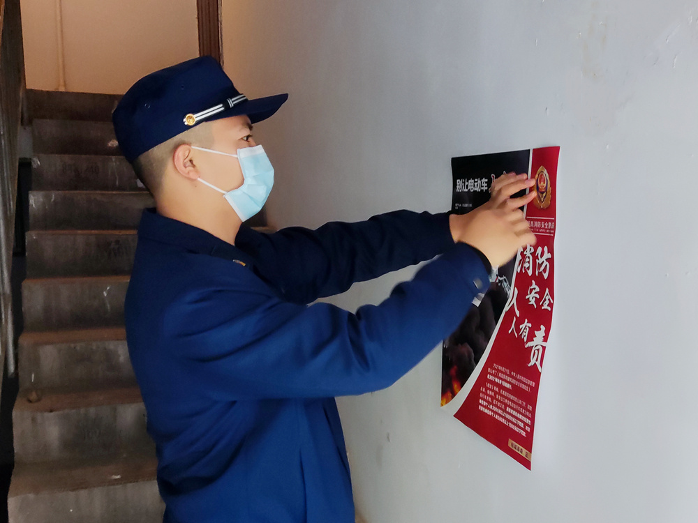在住宅小區張貼消防安全海報。馬媛媛 攝
