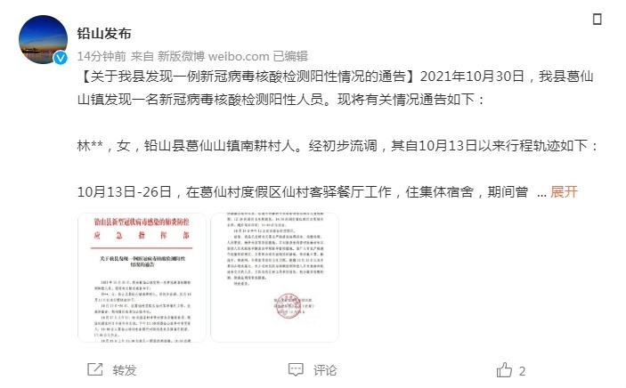 2021年10月30日,江西鉛山縣葛仙山鎮(zhèn)發(fā)現(xiàn)一名新冠病毒核酸檢測(cè)陽(yáng)性人員。現(xiàn)將有關(guān)情況通告如下: