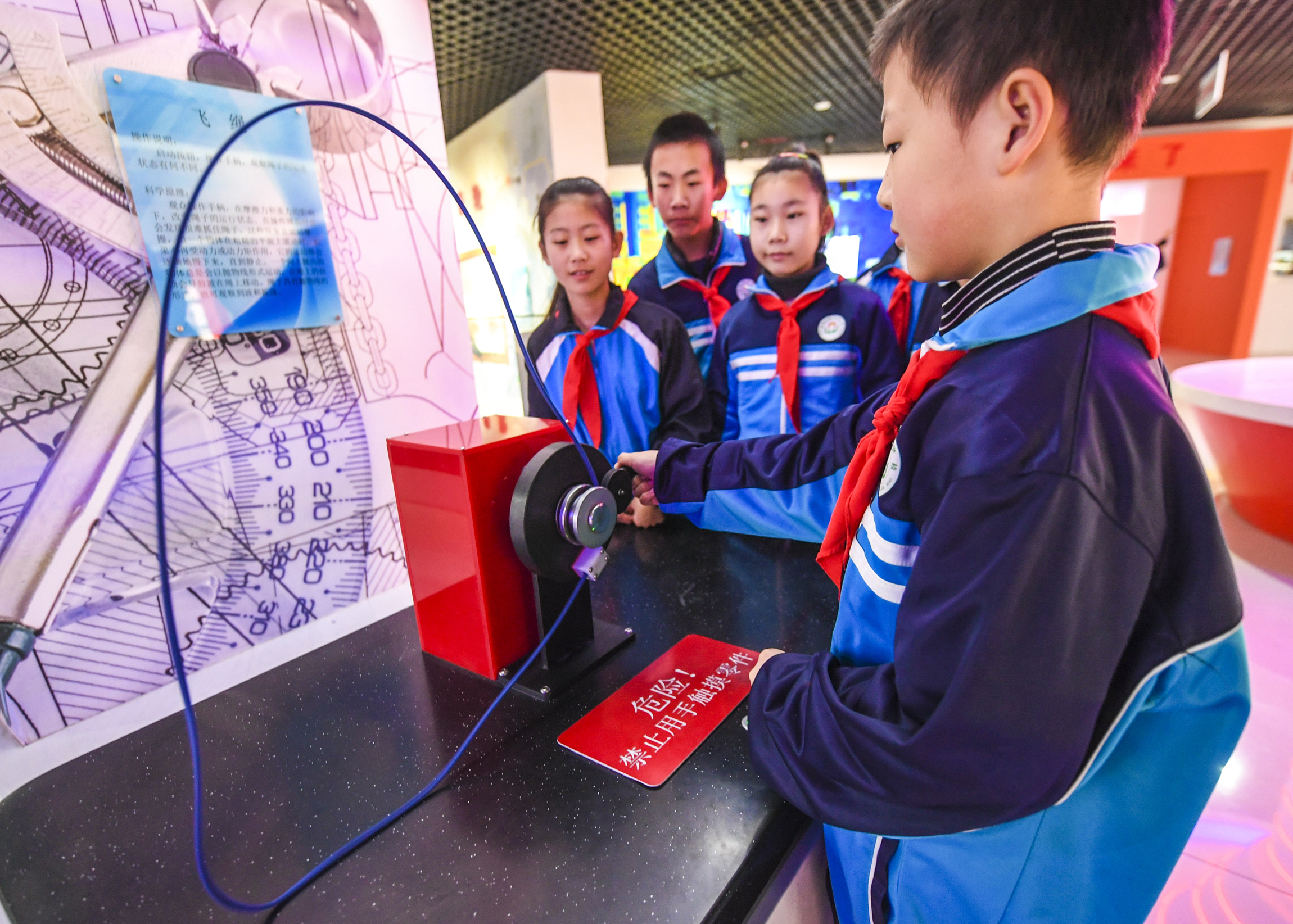 在科學技術館探索與發現展廳,學生在“飛繩”互動展教設備前體驗。