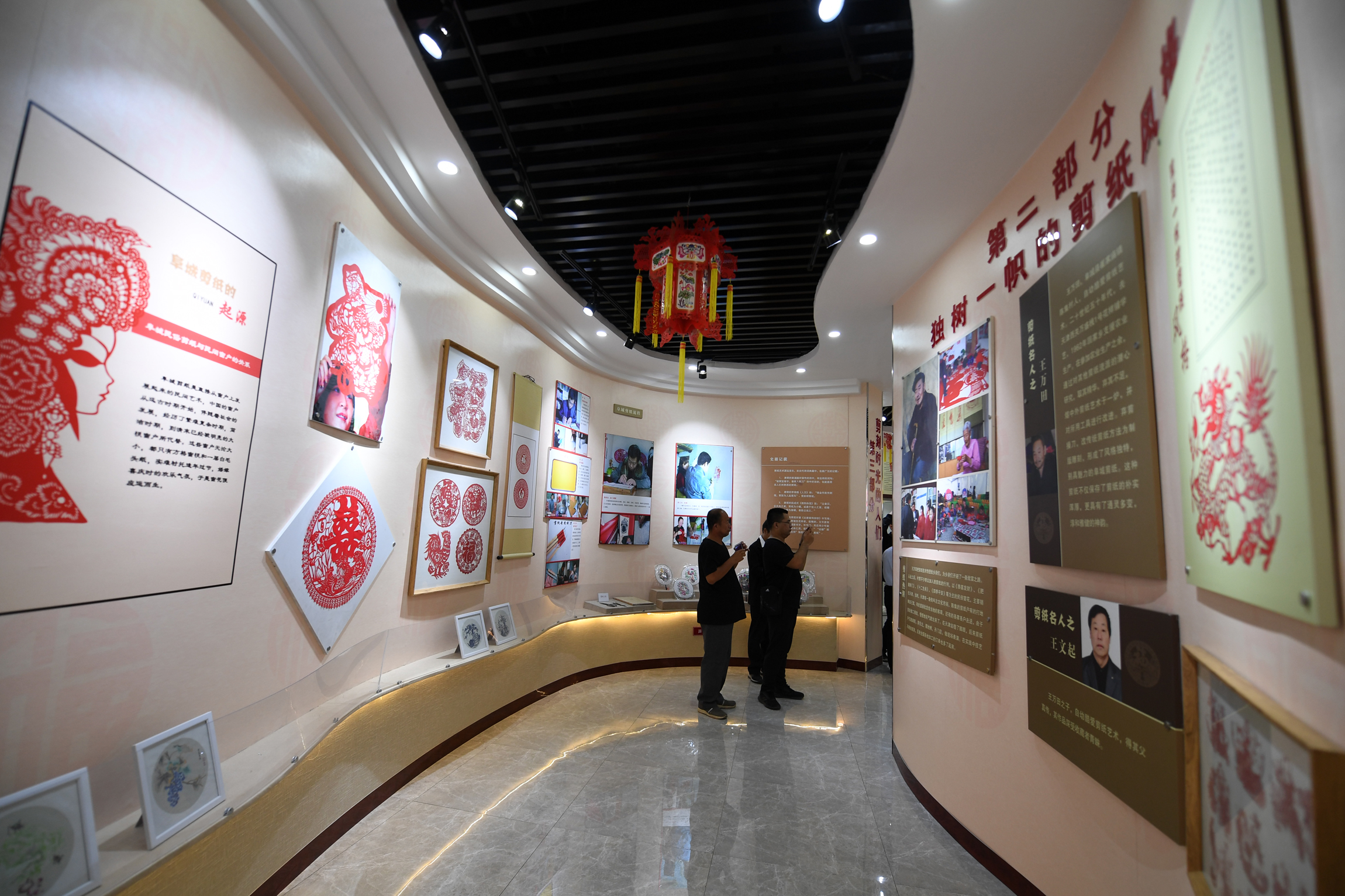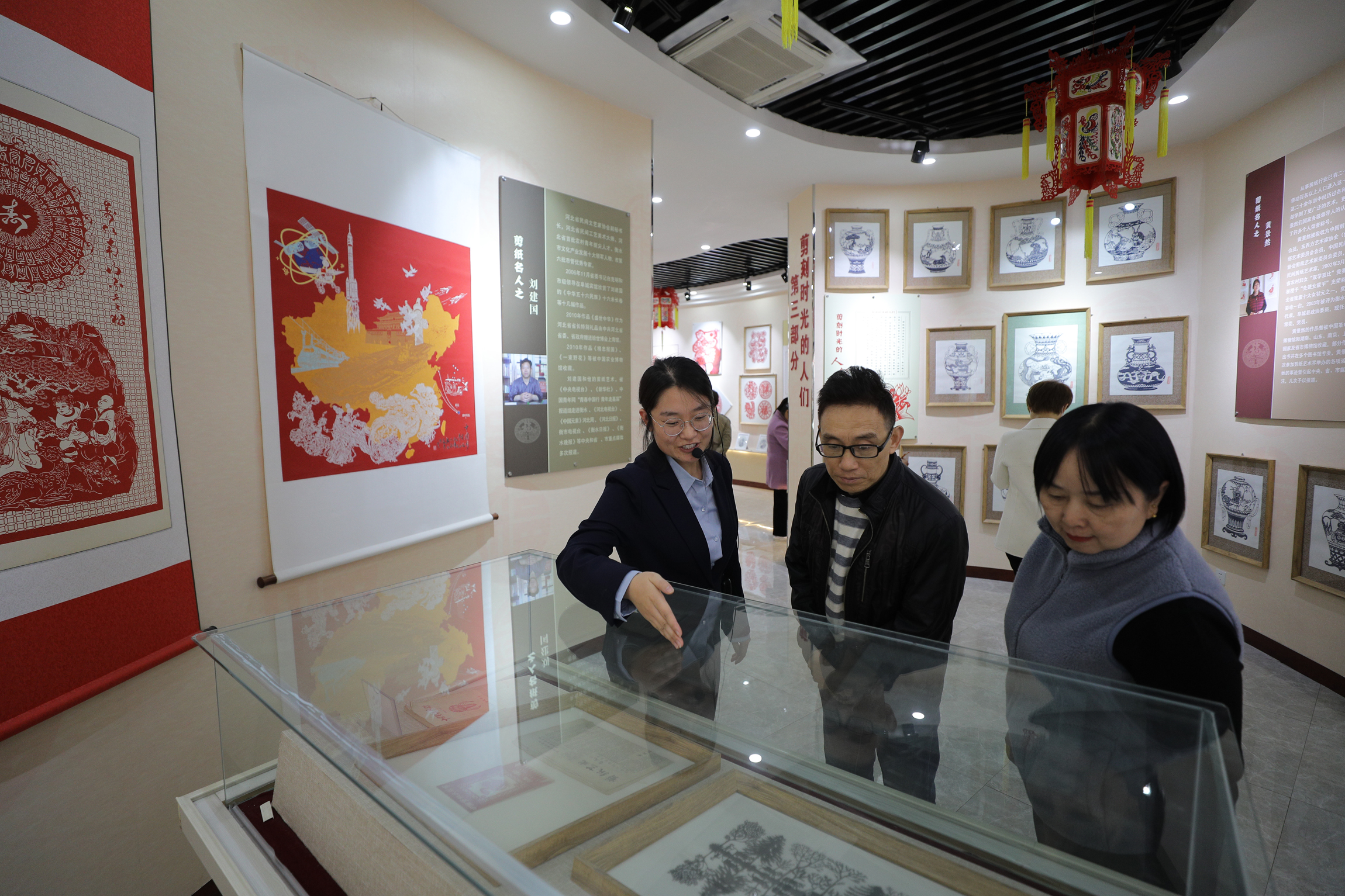剪紙藝術館內講解員正在為游覽者進行講解服務。